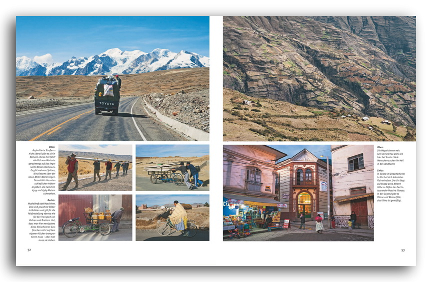 Über 240 Bilder zeigen Bolivien in all seinen Facetten. Vier Specials berichten über den Lago Titicaca, Südamerikas größten Hochlandsee, die Silberstadt Potosi, das Leben der Indigenas und über die artenreiche Flora und Fauna, der man nicht nur in den Nationalparks begegnet.