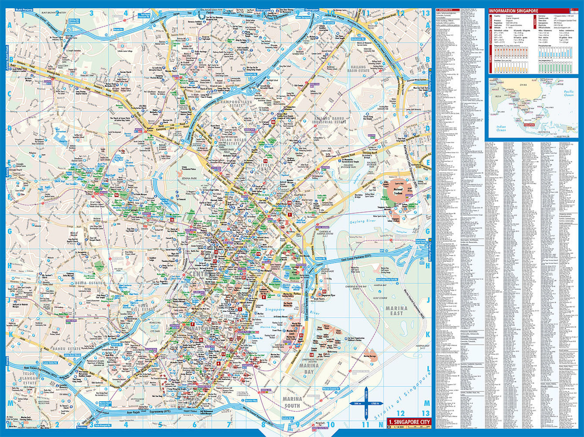 Unsere folienbeschichtete und gefaltete Borch Map von Singapore in der 2. Auflage beinhaltet: Singapur City 1:14 000, Singapur 1:120 000, Sentosa Island 1:25 000, Changi Airport 1:4 000, das öffentliche Verkehrsnetz des MRT und LRT und eine administrative Übersichtskarte von Südostasien und Indonesien. Borch Maps beinhalten eine Vielzahl interessanter und nützlicher Informationen wie Top Sights, Museen, Monumente, Märkte und viele weitere Sehenswürdigkeiten, aber auch Statistiken, Umrechnungstabellen, Klimadiagramme und viele detailreiche Übersichtskarten, die eine Borch Map zu einem exzellenten Reisebegleiter machen. Kartenformat (offen): 660 x 494 mm.