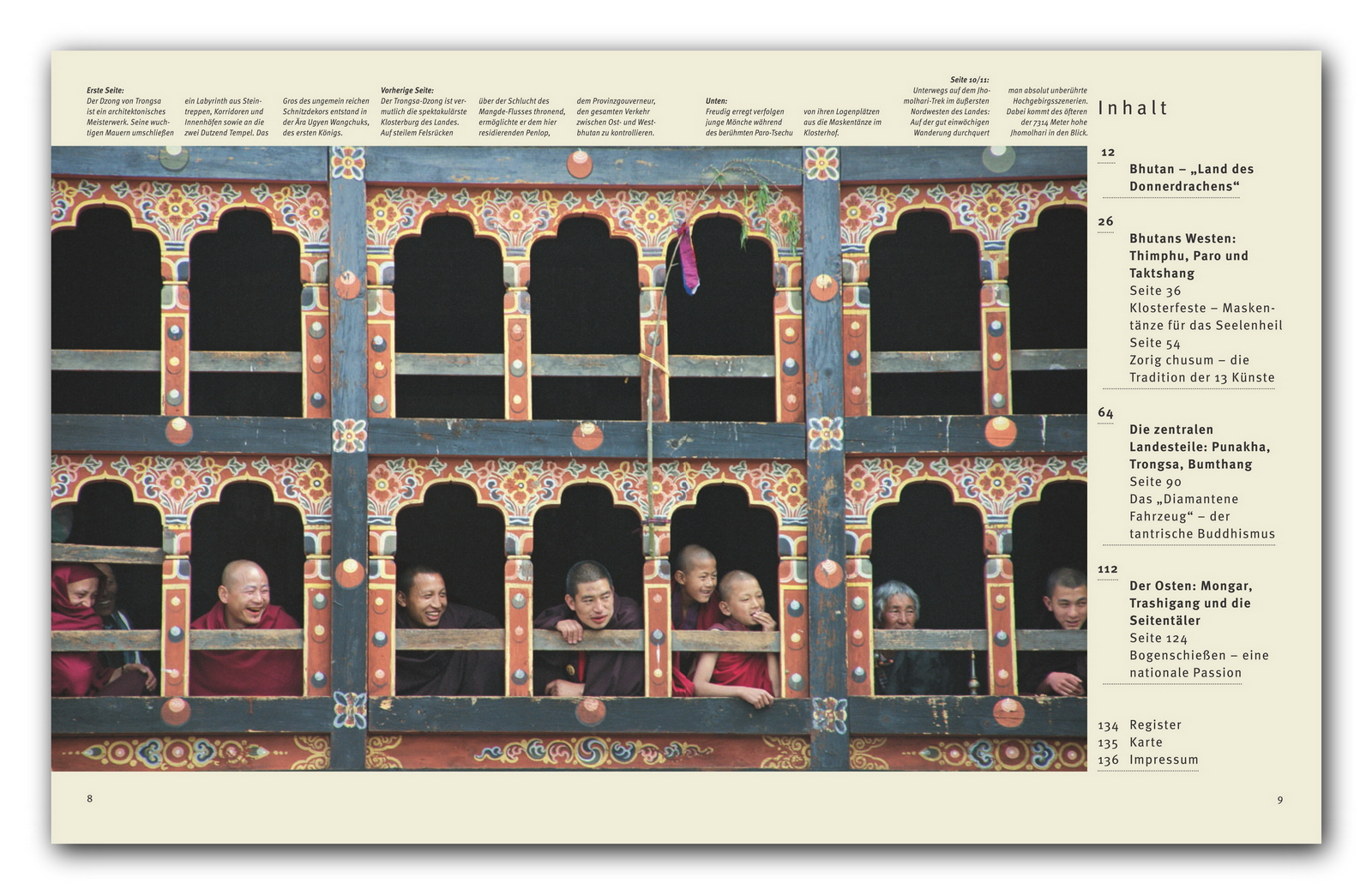 Das Land des Donnerdrachen ist im Westen vor allem als jenes wundersame Königreich bekannt, in dem nicht, wie im Rest der Welt, die Steigerung des Bruttosozial-, sondern des Bruttoglücksprodukts als oberstes Ziel gilt. In der Tat behüten die nur 700 000 Bewohner dieses kleinen, zwischen den Giganten Indien und China eingezwängten Himalajastaats sowohl ihr einzigartiges kulturelles Erbe, als auch ihre politische Unabhängigkeit und die Unversehrtheit der Umwelt mit beispielloser Weitsicht. Gut zwei Drittel ihrer Heimat, die sich vom tropischen Tiefland im Süden nordwärts bis zu gletscherbedeckten Siebentausendern erstreckt, sind dicht bewaldet ein Naturparadies, in dem seltene Orchideen und Rhododendren wuchern und noch Tiger, Schneeleoparden sowie das kuriose Nationaltier Takin leben. Die stark tibetisch beeinflusste Kunst des Landes, ihre Geistigkeit und Poesie, offenbart sich Reisenden vor allem in den zentralen Mittelgebirgstälern: Unterwegs auf der schmalen Fernstraße, die sich von der Hauptstadt Thimphu durch sattgrüne Täler und über schwindelerregende Pässe 500 Kilometer weit bis in den Ostdistrikt Trashigang windet, stößt man allerorten auf malerische Tempel und Klöster, Chorten und Mani-Mauern. Ein Augenschmaus sind die Dörfer und Weiler mit ihren bis heute händisch gezimmerten und kunstvoll beschnitzten Holzhäusern. Architektonische Höhepunkte bilden der Pilgertempel Taktsang alias Tigernest und die über das Land verstreuten Dzongs, mächtige Klosterburgen, von denen die imposantesten in Paro, Punakha, Wangdue und Trongsa thronen. Was sich Besuchern besonders tief ins Gedächtnis gräbt, ist das ungemein gelassen-freundliche Wesen der Bevölkerung. Es gründet in der tiefen Religiosität der Menschen, die, obwohl gegen die Verlockungen der Moderne, Popmusik, Handys, Geländewägen, keineswegs immun, unverbrüchlich der Karma-Lehre, aber auch dem Glauben an Dämonen und Schutzgeister verhaftet sind.
