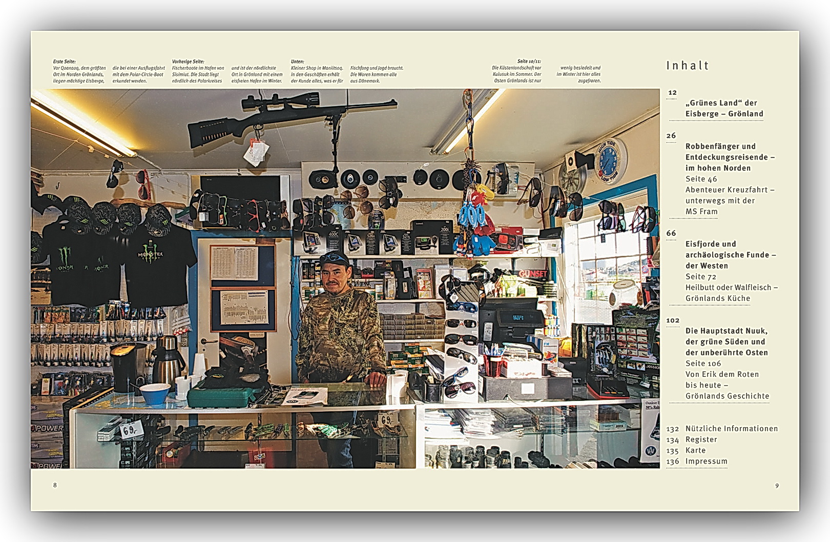 Eisberge in allen Formen, Größen und Farbschattierungen. Dramatische Gletscher und eine gigantische Eiskappe, die fast das gesamte Land überzieht. Jäger und Fischer, die ihrem täglichen Handwerk nachgehen, Künstler, die aus Tierknochen magische Zauberwesen erschaffen und Museen, die aus einem unbekannten Leben am Rande der Welt erzählen. Grönland ist vielfältiger, als man es sich vorstellt. Unvorstellbare Mengen an Eis bestimmen zwar unser Bild von Grönland, und mehr als 80 Prozent der gesamten Landfläche sind auch vom Inlandeis bedeckt. Doch Grönlands Leben findet nicht im Inneren des Landes statt. An den Küsten zeigt sich die größte Insel der Welt von einer äußerst abwechslungsreichen Seite, hier lebt die gesamte Bevölkerung und hierhin reisen die Besucher.