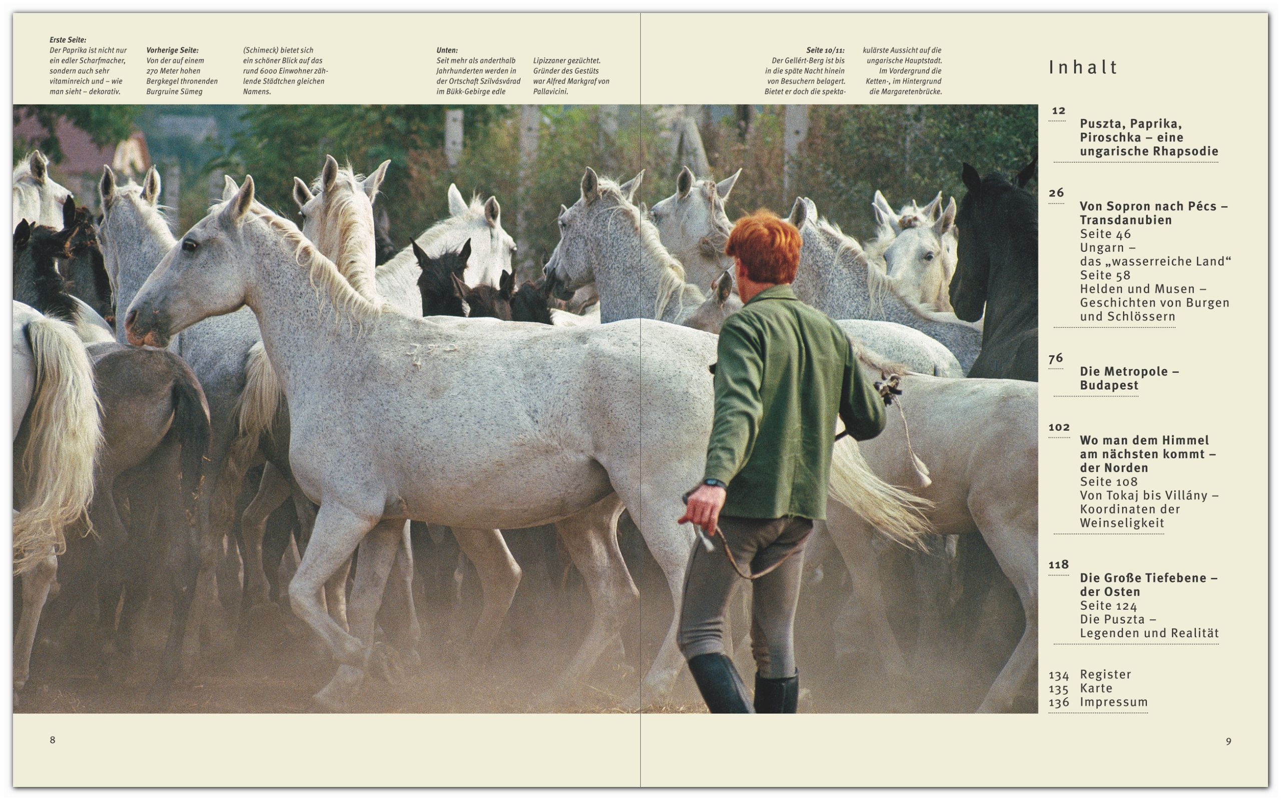 Rund 200 Bilder zeigen die ganze Vielfalt Ungarns. Vier Specials erzählren von den Seen und Thermalquellen des Landes, von den Burgen und Schlössern, von den ungarischen Weinen und von der berühmten Puszta.