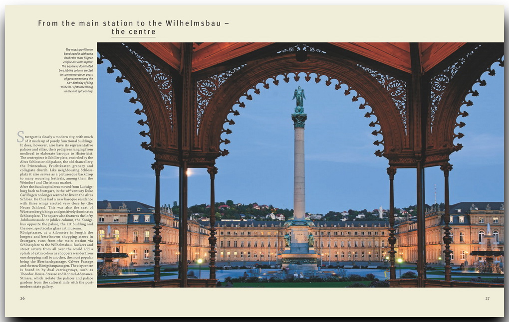 Rund 200 Bilder zeigen die ganze Vielfalt der Stadt. Vier Specials berichten über die Geschichte der württembergischen Herzogs- und Königsresidenz, über die Mineralbäder, über den Mythos der "Auto-(gerechten)-Stadt" und über die wegweisende moderne Architektur, die neben vielen Bauwerken sogar ein "Hängewerk" aufzuweisen hat, den Killesbergturm.