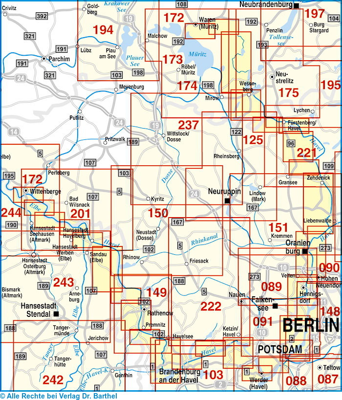 Entlang der Havel vom Quellgebiet bei Ankershagen über Fürstenberg, Berlin und Potsdam bis zur Mündung in die Elbe bei Havelberg. 1:50 000. (mit Zick-Zack Faltung)