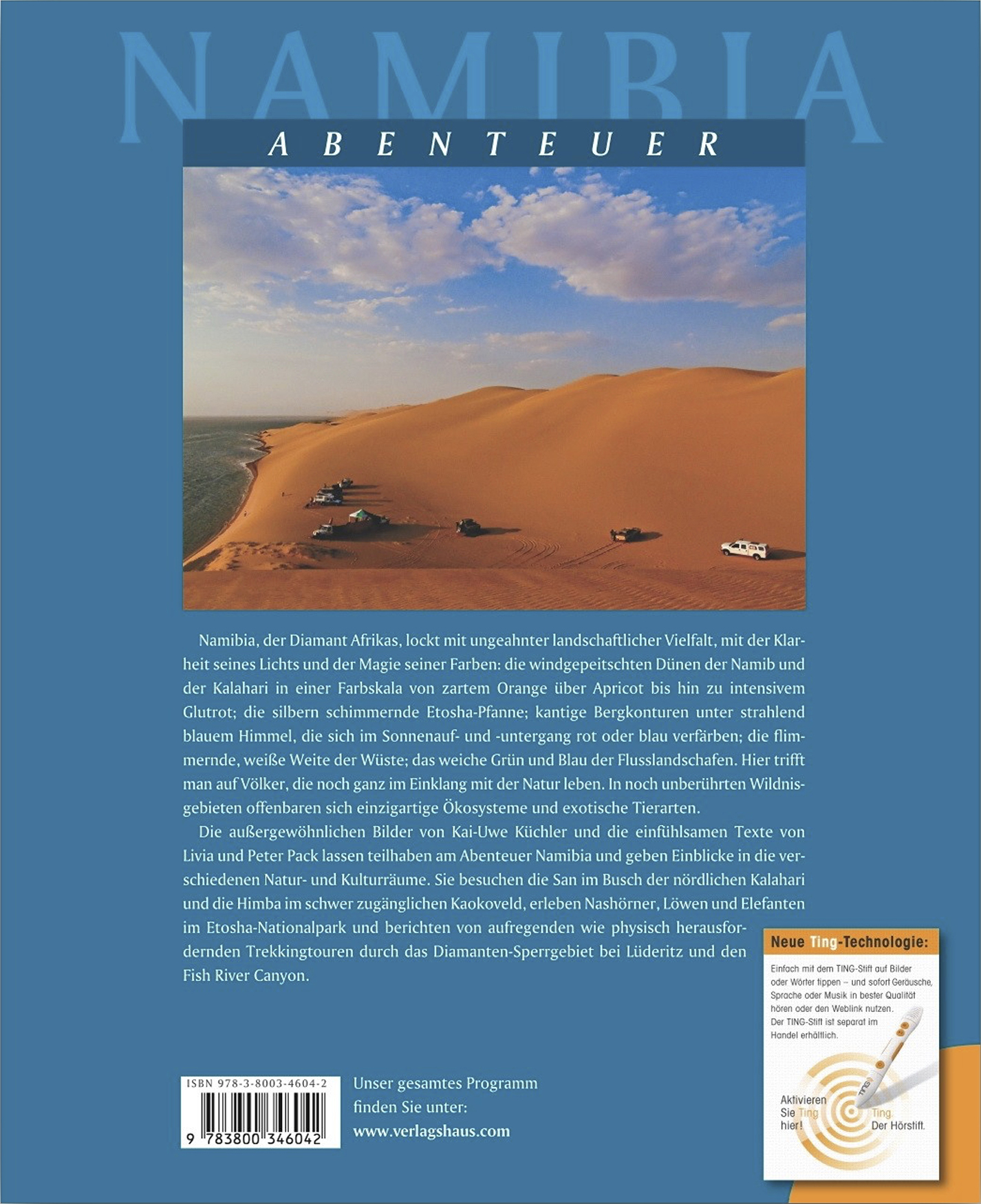 | Schlagworte | Abenteuer • Afrika • Amani Lodge • Bildband • Blutkuppe • Chobe • Damaraland • Deutsch-Südwestafrika • Erongo • Etosha • Fish River Canyon • Kalahari • Kaokoveld • Keetmanshoop • Kolmanskop • Kuiseb River • Messum-Krater • Namibia • Namibia; Bildband • Namib-Wüste • Onjala Lodge • Reisebildband • Sesriem • Sossusvlei • Südwestafrika • Swakopmund • Ting • Ting Buch • Ting (Hörstift) • Twyfelfontein • Windhoek |