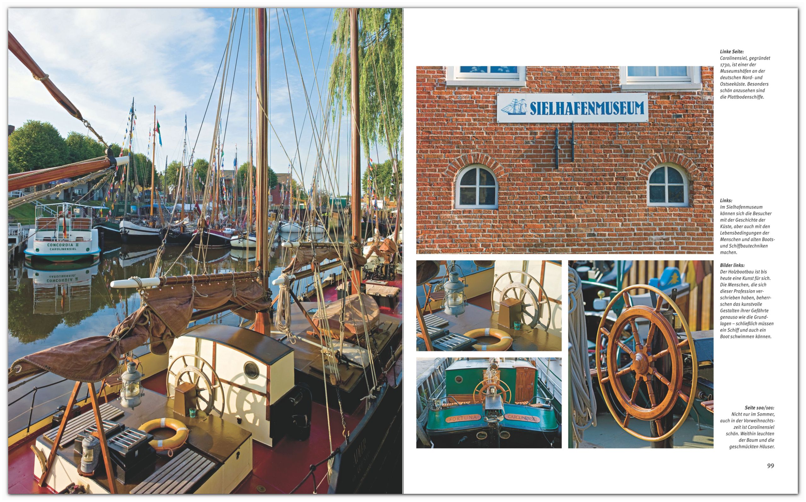 Rund 200 Bilder zeigen Ostfriesland in allen Facetten. Vier Speciels berichten über den einzigartigen Lebensraum des Wattenmeers, die Küche der Region, bekannte Persönlichkeiten und die verdienstvolle Arbeit der Deutschen Gesellschaft zur Rettung Schiffbrüchiger.