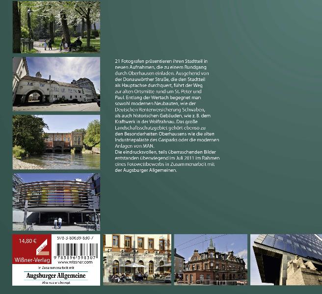 21 Fotografen präsentieren ihren Stadtteil in neuen Aufnahmen, die zu einem Rundgang durch Oberhausen einladen. Ausgehend von der Donauwörther Straße, die den Stadtteil als Hauptachse durchquert, führt der Weg zur alten Ortsmitte rund um St. Peter und Paul. Entlang der Wertach begegnet man sowohl modernen Neubauten, wie der Deutschen Rentenversicherung Schwaben, als auch historischen Gebäuden, wie z. B. dem Kraftwerk in der Wolfzahnau. Das große Landschaftsschutzgebiet gehört ebenso zu den Besonderheiten Oberhausens wie die alten Industriepaläste des Gasparks oder die modernen Anlagen von MAN.Die eindrucksvollen, teils überraschenden Bilder entstanden überwiegend im Juli 2011 im Rahmen eines Fotowettbewerbs in Zusammenarbeit mit der Augsburger Allgemeinen.