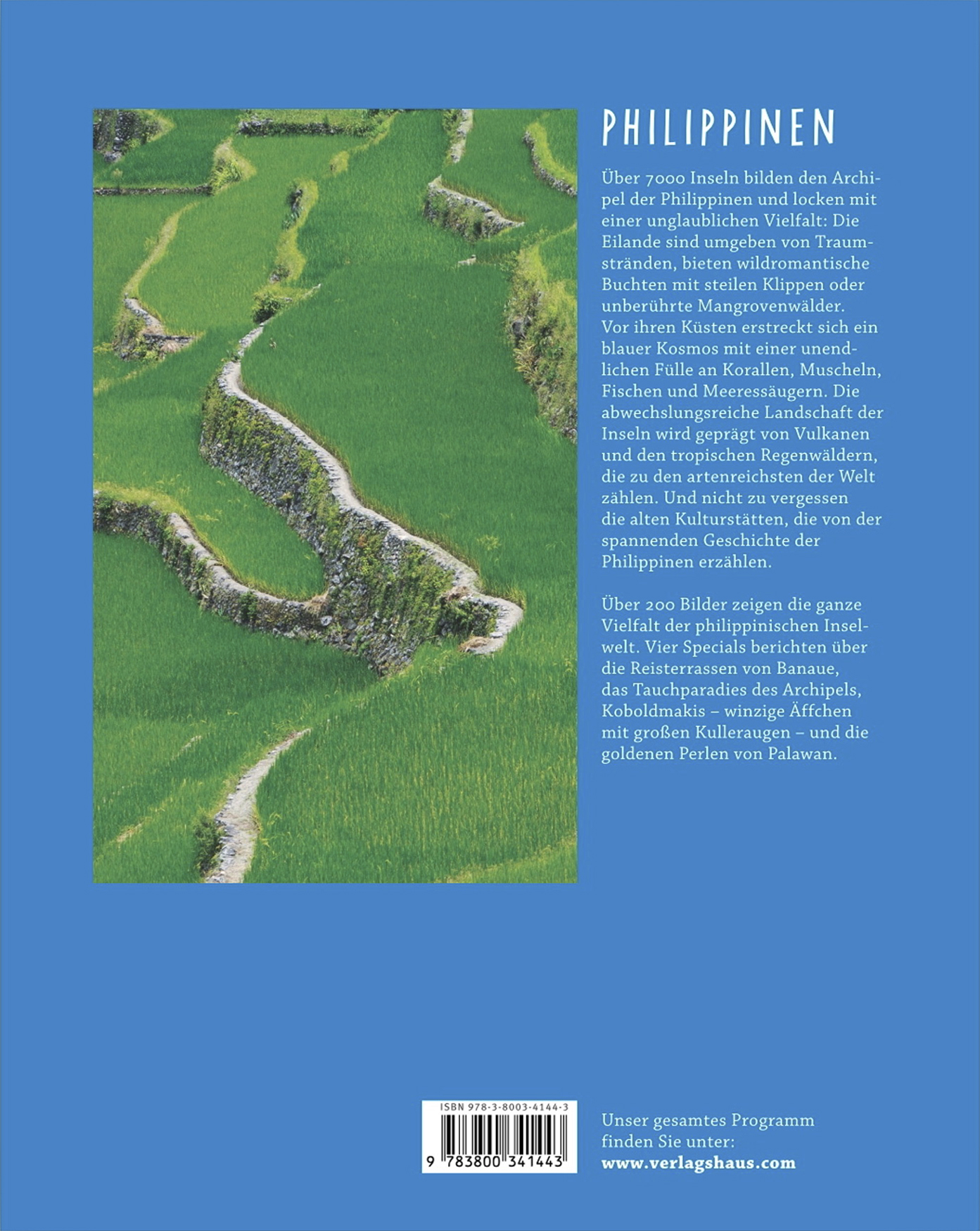 | Schlagworte | Baclayon • Banaue • Bangui Bay • Batad • Batanes Islands • Bildband • Bohol • Cabilao Island • Calabugdong Island • Calamian-Inseln • Cebu • Chocolate Hills • Coron • El Nido • Honda Bay • Indischer Ozean • Insel der Philippinen • Luzon • Manila • Mindanao • Palavan • Panglao Island • Philippinen • Philippinen; Bildband • Pinatobu • Regenwald • Reisebildband • Sagada • Taal • Vigan |