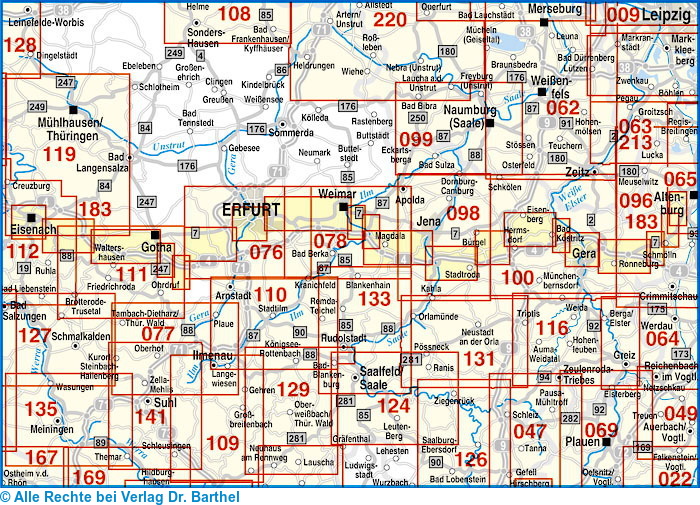 | Schlagworte | Albersdorf, Altenburg, Aspach, Bad Klosterlausnitz, Bad Köstritz, Bechstedtstraß, Bobeck, Bollberg, Brahmenau • Altenburg-Colditz-Radroute, Hofladenroute, Deutschland-Route D4, Elsterradweg, Thüringer Mühlenradweg • Bucha, Caaschwitz, Daasdorf a. Berge, Drei Gleichen, Döbritschen, Ebenheim, Eisenach, Eisenberg • Emleben, Erfurt, Frankendorf, Fröttstädt, Gera, Gotha, Großbockedra, Großenstein, Großschwabhausen • Günthersleben-Wechmar, Hammerstedt, Hartmannsdorf, Hermsdorf, Heukewalde, Hopfgarten, Hörselgau • Jakobsweg Erfurt-Paulinzella, Rennsteig, Fernwanderweg Eisenach-Budapest, Fürstenstraße der Wettiner, Herkules-Wartburg-Radweg, Radwanderweg am Rennsteig • Jonaswalde, Kapellendorf, Kleinbockedra, Kleinschwabhausen, Korbußen, Kromsdorf, Laasdorf, Laucha, Lehnstedt • Löbichau, Magdala, Mechterstädt, Mellingen, Möckern, Mönchenholzhausen, Mörsdorf, Nesse-Apfelstädt • Niederzimmern, Nohra, Nöbdenitz, Ottstedt a. Berge, Paitzdorf, Posterstein, Quirla, Rauda, Rausdorf, Reichenbach • Ökumenischer Pilgerweg Görlitz-Vacha, Laura-Radweg, Historisches Wegesystem 1806, Thüringenweg • Ronneburg, Ruttersdorf-Lotschen, Saara, Scheiditz, Schleifreisen, Schlöben, Schmölln, Schwaara, Silbitz • Saale-Radwanderweg, Deutschland-Route D11, Saalehorizontale, Ilmtal-Radweg, Feininger-Radweg • Stadtroda, Sulza, Tautenhain, Teutleben, Tissa, Tröbnitz, Trügleben, Umpferstedt, Vollmershain, Waldeck • Thüringen, Karte; Radkarte • Thüringen, Karte; Wanderkarte • Thüringen; Radkarten • Thüringen; Wanderkarten • Waltershausen, Weimar, Weingarten, Weißenborn, Wutha-Farnroda, Zöllnitz Pleiße-Radwanderweg |