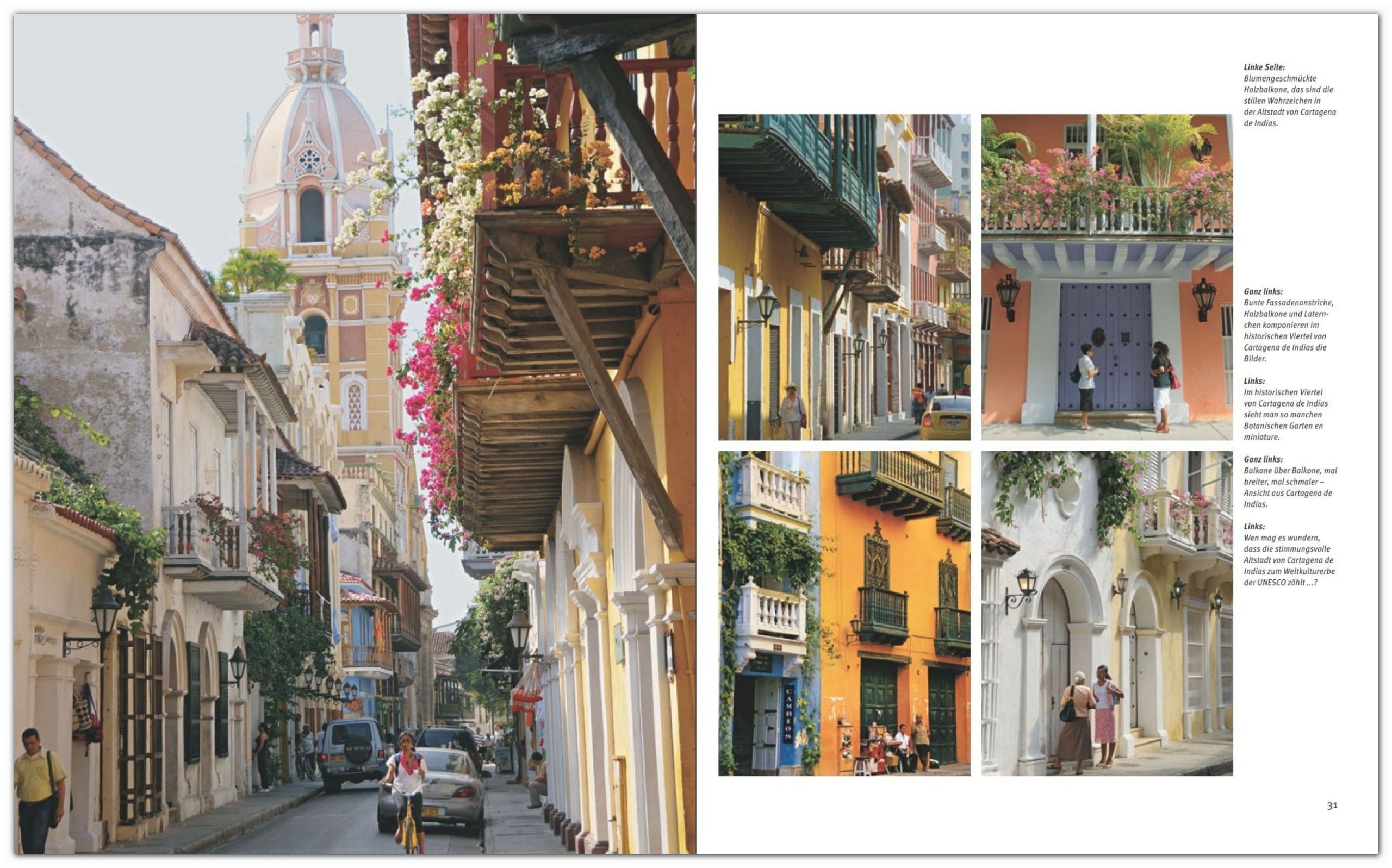 Rund 200 Bilder zeigen die ganze Vielfalt Kolumbiens. Vier Specials berichten über das spanische Erbe der Kolonialarchitektur, die Erfolgsgeschichte des kolumbianischen Kaffees, die versunkenen Kulturen und die indigenen Völker im Spiegel von Geschichte und Gegenwart.