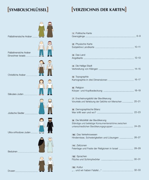 All dies gibt mir ein Gefühl, an einem der kompliziertesten Orte der Welt zu leben, drängt mich, seine Komplexität verstehen zu wollen und sie aufzulösen. Aber: Je tiefer ich in die Wirklichkeit eindringe, desto verwirrter werde ich. Dieser Atlas unternimmt den Versuch, diese Komplexität des alltäglichen Lebens zu verstehen, konzentriert sich dabei auf die verschiedenen Bevölkerungsgruppen, ihre Nähe und Distanz und die Punkte des Zusammenstoßens. Im Gegensatz zu einem normalen Atlas, der von seiner Definition her versucht, die Wirklichkeit objektiv darzustellen, versucht dieses Buch sich den Realitäten anhand subjektiver Wahrnehmungen zu nähern.
