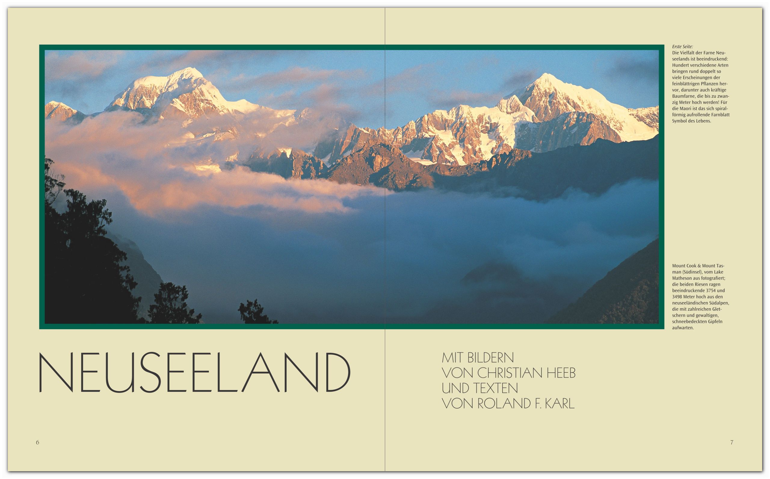 Dampfende Quellen, Schwefelwasserseen in den schillerndsten Farben und bis zu zwanzig Meter hohe Geysire liegen entlang einer heißen Spur, der man durch ganz Neuseeland folgen kann: beginnend auf der äußerst aktiven Vulkaninsel White Island bis zur Südinsel mit ihren heißen Hammer Springs. Eine sanftere Seite Neuseelands erschießt sich in grünen Hügeln, getupft von weißen Schafen, an Traumstränden, die es mit jeder Südseeromantik aufnehmen können. Phantastische Wanderreviere liegen in der reizvollen Bergwelt der Southern Alps und einer Herausforderung sind die hohen Gipfel des Mount Cook, Mount Taranaki oder Mount Tasman.