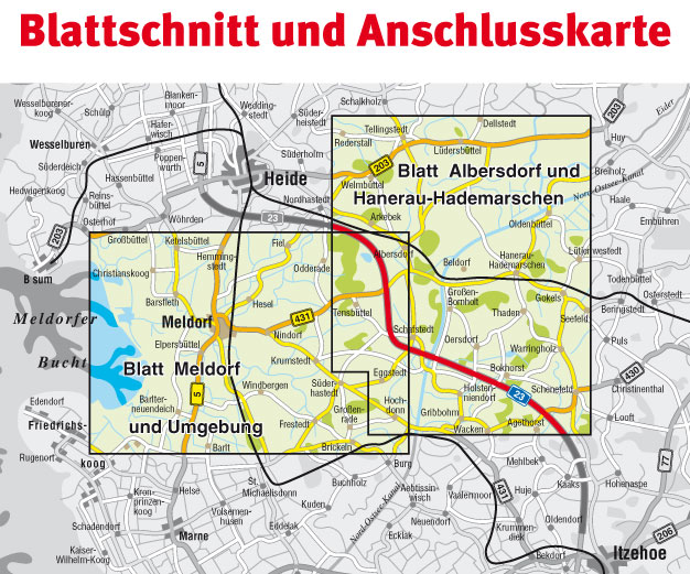 Das Amt Mitteldithmarschen - hervorgegangen aus den Ämtern Meldorf-Umland und Amt Albersdorf, sowie der Stadt Meldorf - ist in diesem Kartenset mit Straßenverzeichnis und allen öffentlichen Einrichtungen dargestellt.Da für die Freizeitgestaltung rund um Albersdorf auch die östliche Seite des Nord-Ostsee-Kanal mit Hanerau-Hademarschen aufgenommen wurde, reicht dieses Kartenset von der Meldorfer Bucht bis nach Oldenbüttel.Mit 38 km in der Ost-West-Ausdehnung und z.T. 25 km in der Nord-Süd-Ausdehnung bildet das Kartenset 617 qkm im Präzisionsmaßstab 1:25.000 ab. 14 Detailkarten in den Maßstäben von 1:7.500, 1:10.000 und 1:15.000 mit allen Straßenverzeichnissen bieten für alle erforderlichen Alltagsorientierungen von Ärzten, über die verschiedenen Schulformen, bis zu den behördlichen Einrichtungen eine genaue Orientierung.Die Freizeitkartenseite umfasst alle Radrouten und Wanderwege der Region. Die touristischen Radrouten wie Nordseeküstenradweg, Nord-Ostsee-Kanal-Route, und Eider-Treene-Sorge-Radweg sind extra markiert. Örtliche Radrundwanderwege und das ortsverbindende Radroutennetz sind ebenfalls markiert. Wo erforderlich wurden Rundwanderwege mit den in der Örtlichkeit genutzten Farbmarkierungen hervorgehoben. Die HISTOUR-Punkte fehlen ebensowenig in der Karte wie alle anderen Freizeiteinrichtungen von der Badestelle, über die Fahrradwerkstatt, bis zu den Einkehrmöglichkeiten.