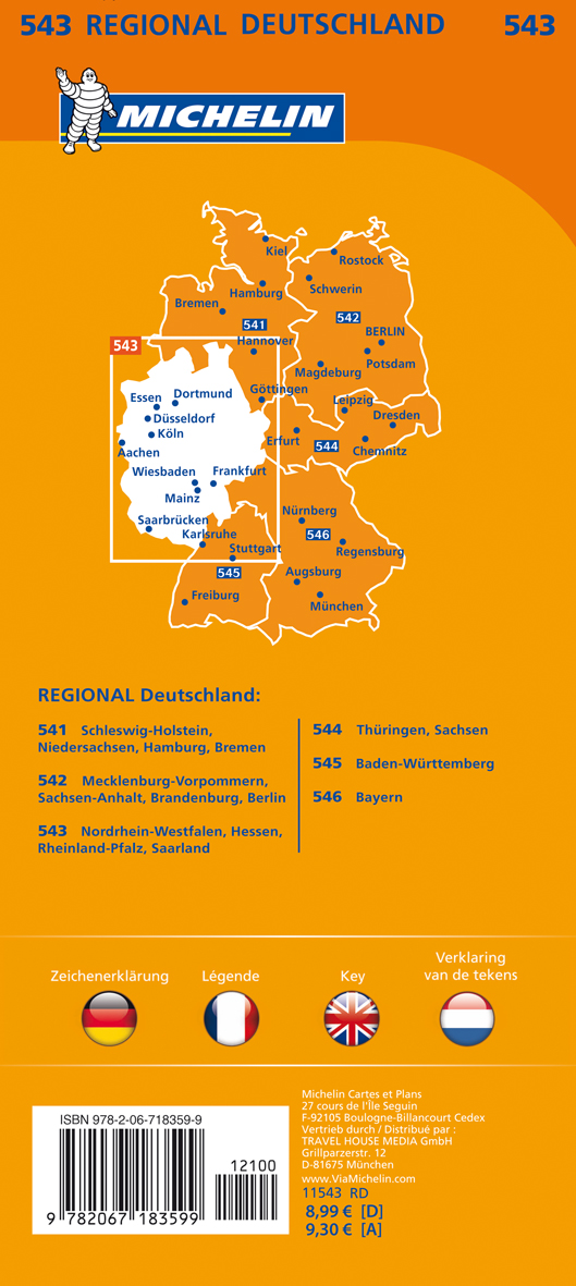 Straßen- und Tourismuskarte 1:350.000; Auflage 2017. Stadtpläne: Frankfurt a. Main, Düsseldorf, Köln, Dortmund, Essen, Ruhrgebiet, Register auf der Rückseite, Entfernungen und Fahrzeiten