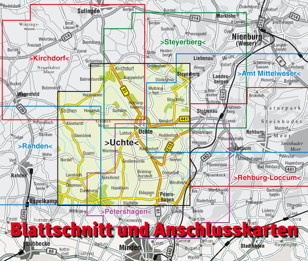 Freizeitkarte, Radkarte, Samtgemeindeplan, Hausnummernfinder, das ist der KVplan Uchte. Die FREIZEITKARTE zeigt ein 575 qkm großes Gebiet. Die Region von Petershagen im Süden bis Steyerberg und Kirchdorf im Norden ist erfasst. Die über 80 Punkte umfassende Symbollegende reicht vom Abenteuerspielplatz über die Fahrradwerkstadt bis zur Einkehrmöglichkeit und dem Sigwardsweg. Für das 3.263 Hektar große EU-Vogel- und Naturschutzgebiet „Uchter Moor“ sind nicht nur die Moorbahn, Informationszentrum und Beobachtungsturm dargestellt, auch die historischen Namen der Dämme sind erfasst. Als RADKARTE sind nicht nur die befestigten Wege von den unbefestigten unterschieden, sondern auch alle Radrouten sind separat aufgeführt (u.a. Weserradweg, Große Weserlandroute, Meerweg, Radfernweg D9, BahnRadRoute Weser-Lippe, Energie-NaTour, HochZeit-Reise, WasserLand-Weg, Landpartie, LandArt-Route, Mühlen-Route, Energie-Entdecker-Route, Kirche im Dorf, Moor-Tour, Storchentour). Als SAMTGEMEINDEPLAN zeigt die Karte die Infrastruktur. Die 80 Punkte umfassende Wege- und Symbollegende reicht von der Apotheke über Neubaugebiete bis zur Tankstelle. Im Maßstab 1:12.500 gibt es Detailkarten des Flecken Uchte, Essern, Diepenau, Lavesloh, Warmsen und Barmhorst. Zum HAUSNUMMERNfinden gibt es für die Ortsteile Planquadratshinweis der einzelnen Hausnummern. In Brüninghorstedt, Darlaten, Dierstorf, Fuchsberg, Glissen, Gräsebilde, Größenvörde, Halle, Harrienstedt, Höfen, Hoysinghausen, Huddestorf, Jenhorst, Kleinenherse, Kleines Holz, Lohhof, Raddestorf, Sapelloh, Warmsen-Birkenbusch, Westenfeld, Woltringhausen ist das Auffinden gesuchter Adressen somit sichergestellt. Ein Übersichtplan sowie Texte und Geschäftsempfehlungen runden die Informationsvielfalt ab.