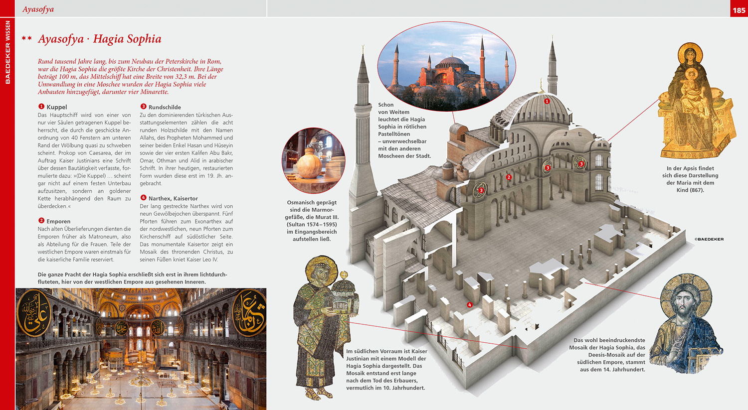 Infografiken zeigen u.a. Istanbul auf einen Blick, das wechselvolle Spiel der Namensgebung der Stadt und das ehrgeizige Marmaray-Projekt gegen den Verkehrsinfarkt. Einzigartige 3D- Darstellungen geben lebendige Einblicke in die Hagia Sofia und die Blaue Moschee Sultan Ahmet Camii. Baedeker-Tipps verraten u.a. wo man garantiert byzantinische Fälschungen erstehen, wo man lebendiges Mittelalter erleben kann, und warum man sich zwischen französischen Straßen und asiatischer Bildung entscheiden darf.