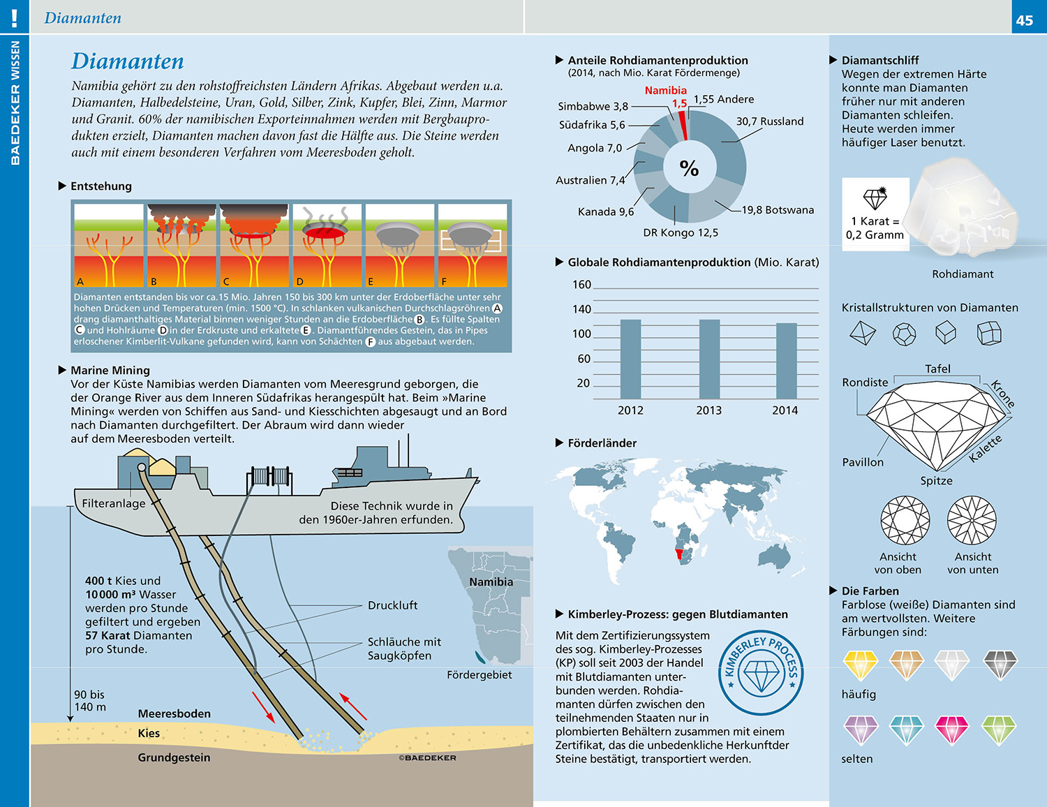 Infografiken zeigen u.a. Namibia auf einen Blick, Diamanten und ein Tierlexikon. Einzigartige 3D-Darstellungen geben lebendige Überblicke vom Fish River Canyon und den Victoria Falls. Die Baedeker-Tipps verraten, warum man gut schwimmen können, fit sein und viel Kraft haben muss um in die Luft zu gehen, warum sich rund um die Victoria-Fälle alles um Adventure dreht, wo man in der Namib Skilaufen kann, und wo Meme Melba lokale Spezialitäten serviert.