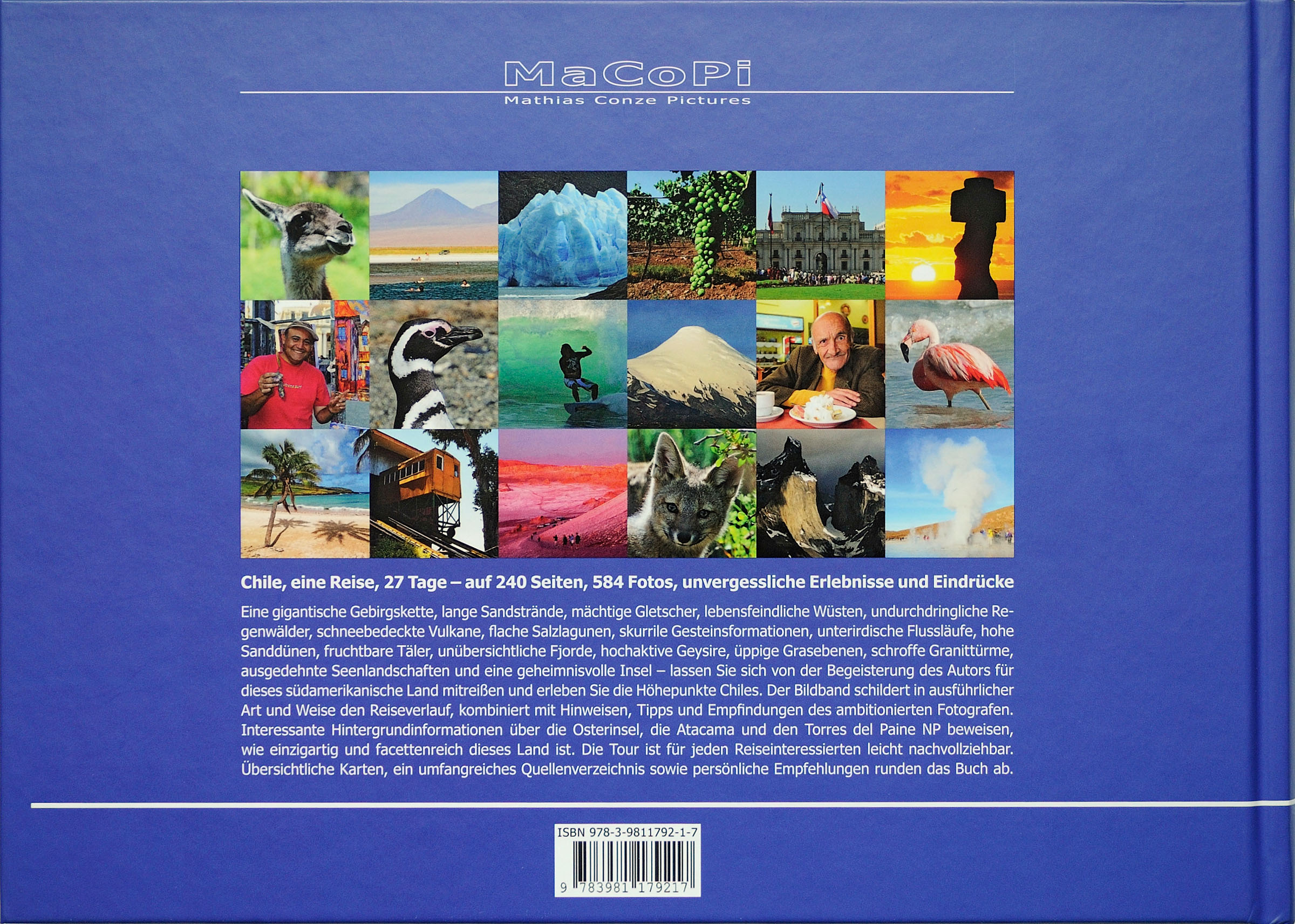 Eine gigantische Gebirgskette, lange Sandstrände, mächtige Gletscher, lebensfeindliche Wüsten, undurchdringliche Regenwälder, schneebedeckte Vulkane, flache Salzlagunen, skurrile Gesteinsformationen, unterirdische Flussläufe, hohe Sanddünen, fruchtbare Täler, unübersichtliche Fjorde, hochaktive Geysire, üppige Grasebenen, schroffe Granittürme, ausgedehnte Seenlandschaften und eine geheimnisvolle Insel – lassen Sie sich von der Begeisterung des Autors für dieses südamerikanische Land mitreißen und erleben Sie die Höhepunkte Chiles. Der Bildband schildert in ausführlicher Art und Weise den Reiseverlauf, kombiniert mit Hinweisen, Tipps und Empfindungen des ambitionierten Fotografen. Interessante Hintergrundinformationen über die Osterinsel, die Atacama und den Torres del Paine NP beweisen, wie einzigartig und facettenreich dieses Land ist. Die Tour ist für jeden Reiseinteressierten leicht nachvollziehbar. Übersichtliche Karten, ein umfangreiches Quellenverzeichnis sowie persönliche Empfehlungen runden das Buch ab.