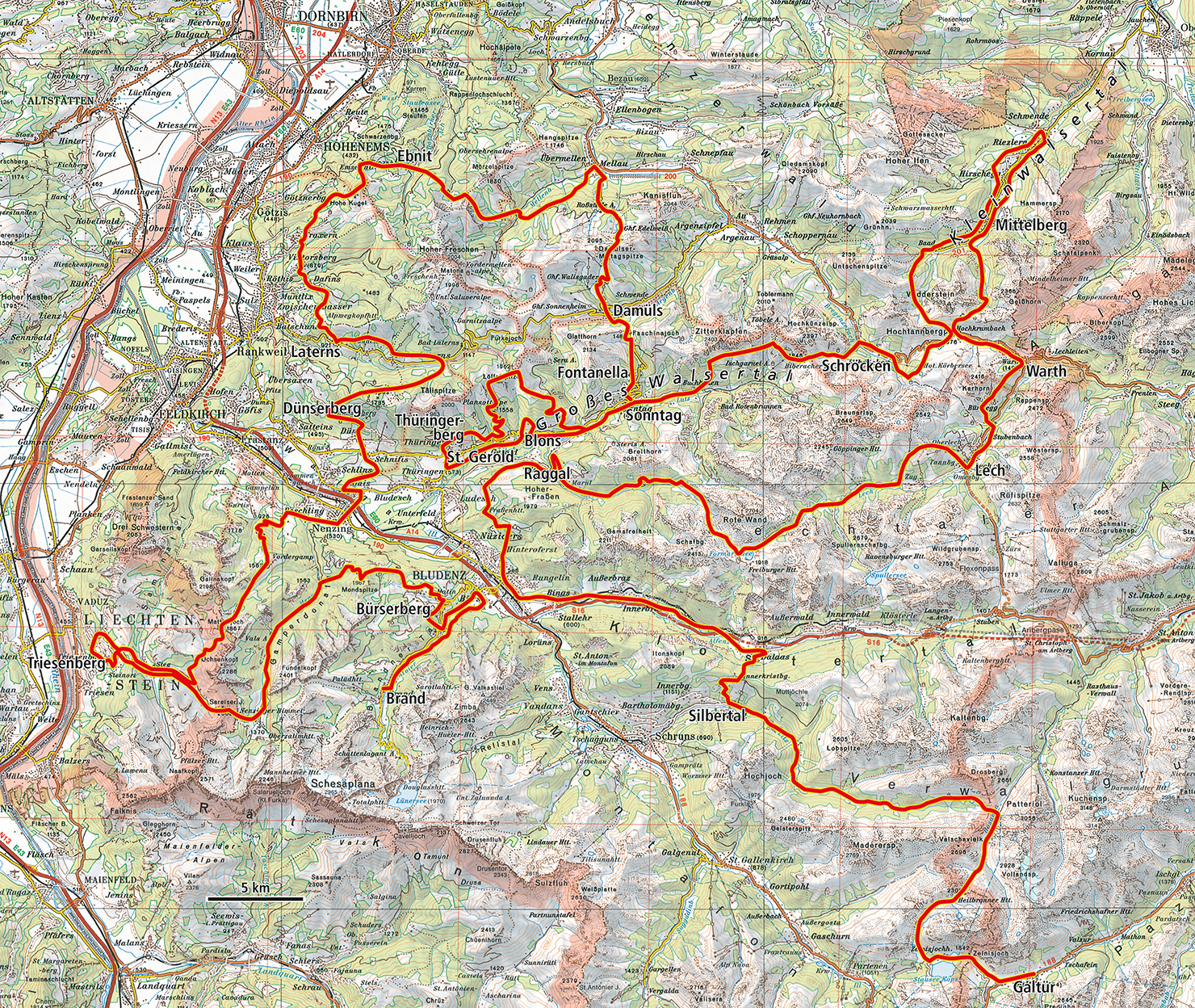 in 25 Etappen vom Brandnertal über Triesenberg nach Laterns und Damüls, ins Große und Kleine Walsertal und über den Tannberg ins Silbertal nach Galtür