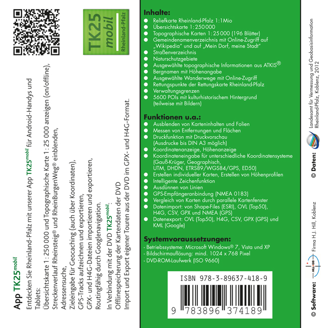Die DVD bietet genaueste topographische Karten im Maßstab 1: 25 000 flächendeckend für Rheinland-Pfalz verknüpft mit den multimedialen Funktionalitäten einer DVD. Funktionen wie Koordinaten- und Höhenanzeige, Streckenmessung, Aus- und Einblenden von Karteninhalten, Erstellen eigener thematischer Karten, Suche über Orte, Straßennamen und Hausnummern, Einblenden weiterer Zusatzinformationen, eine GPS-Schnittstelle u.v.m. erleichtern die Handhabung und das Arbeiten mit topographischen Karten um ein Vielfaches. Die Kombination von Kartendaten mit einem Digitalen Geländemodell im 20 m