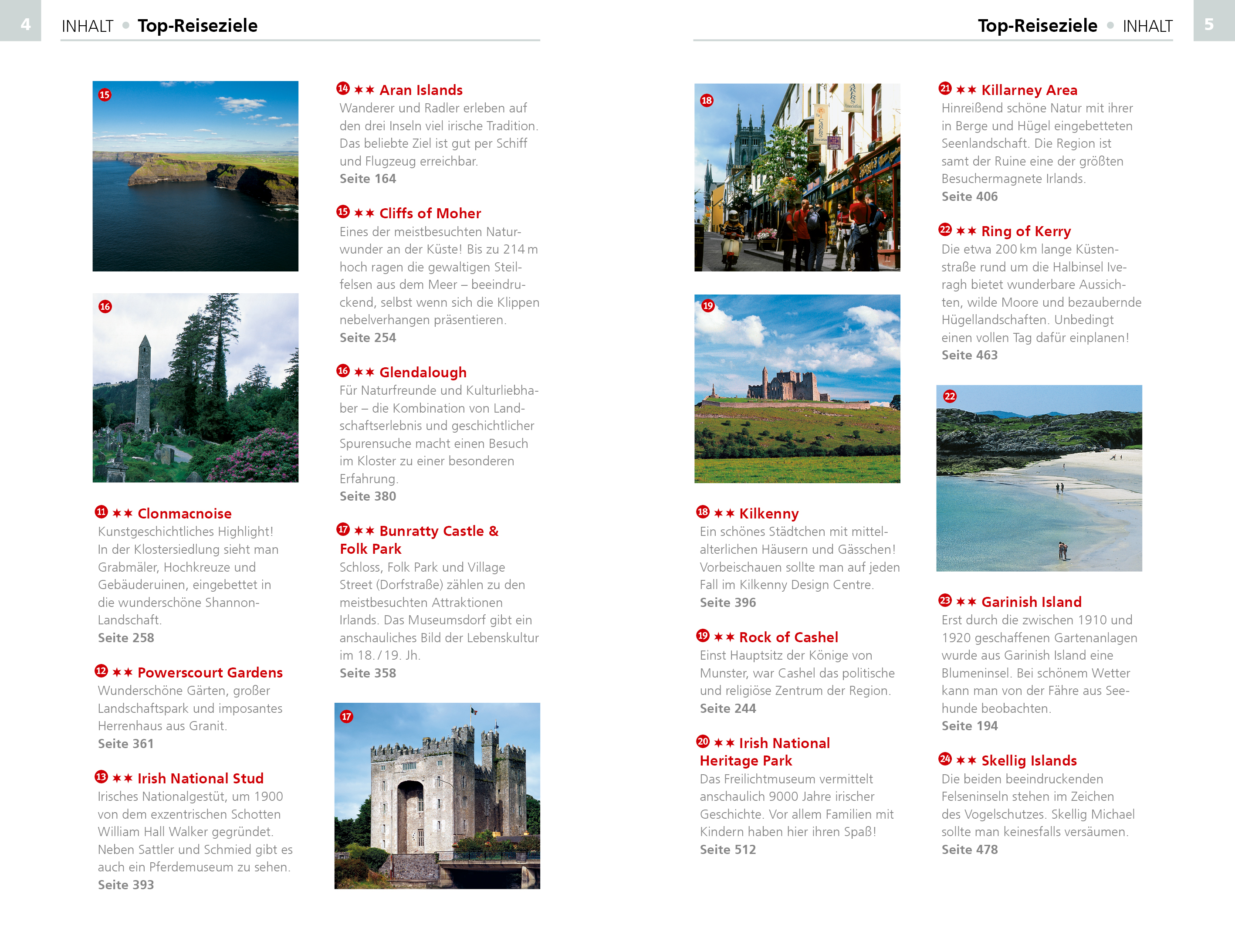 Entdecken Sie Irland unterwegs: Fünf spannende Touren laden zu erlebnisreichen Entdeckungsreisen ein. Auf der Spur der Steine geht es beispielsweise von Dublin nach Belfast. Irlands heimliche Hauptstadt Cork ist Ausgangspunkt einer Schlemmertour durch zauberhafte Landschaften an der "irischen Riviera" und für "Irland-Einsteiger" ist eine Reise durch den wilden Westen mit Whiskey und Lachs genau das Richtige. Orte, die man auf keinen Fall verpassen sollte, sind im großen Kapitel Sehenswürdigkeiten von A - Z ausführlich beschrieben.