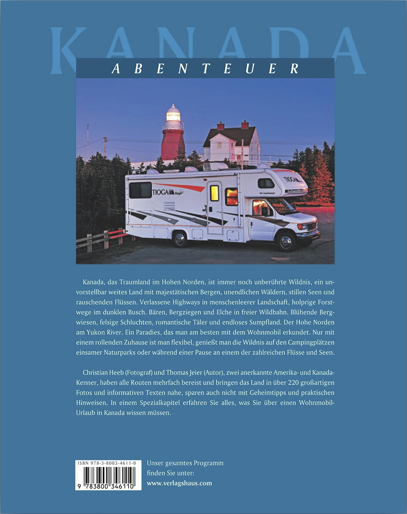 | Schlagworte | Abenteuer • Amerika • Banff • Bildband • British Columbia • Camping • Fraser River • Icefeald Parkway • Jasper • Kanada • Kanada; Bildband • Lake Louise • Montreal • Mount Robson • Nordamerika • Okanagan Valley • Ontario • Quebec • Reisebildband • Rocky Mountains • Toronto • Vancouver • Vancouver Island • Williams Lake • Wohnmobil • Wohnmobilreisen • Wohnmobilurlaub • Wohnwagen • Yellowhead Highway |