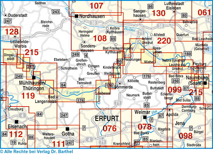 | Schlagworte | Kefferhausen, Dingelstädt, Silberhausen, Helmsdorf, Zella, Horsmar, Dachrieden, Reiser, Ammern, Mühlhausen, Bollsedt, Altengöttern, • Leubingen, Griefstedt, Büchel, Etzleben, Gorsleben, Sachsenburg, Heldrungen, Bretleben, Reinsdorf, Artern, Ritteburg, Schönewerda, Bottendorf, • Thamsbrück, bad Langensalza, Nägelstedt, Großvargula, Herbsleben, Gebesee, Haßleben, Werningshausen, Schallenburg, Sömmerda, • Unstrut / Unstruttal, Karte; Radkarte • Unstrut / Unstruttal, Karte; Wanderkarte • Unstrut / Unstruttal; Radkarten • Unstrut / Unstruttal; Wanderkarten |