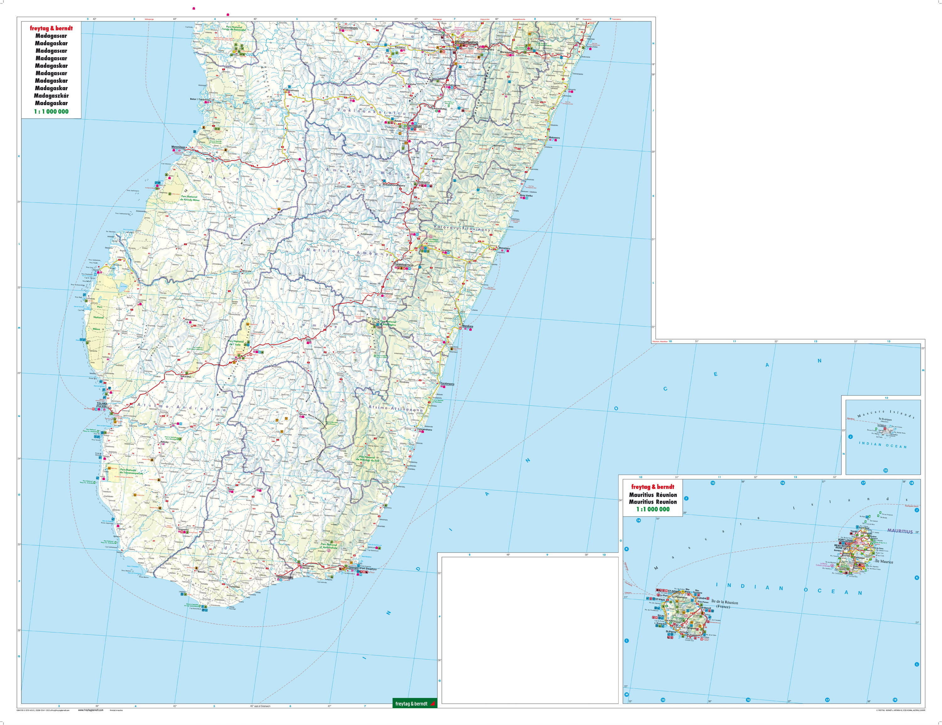 freytag & berndt Autokarten sind für viele Länder und Regionen weltweit erhältlich. Neben der übersichtlichen Gestaltung verfügt die Straßenkarte Madagaskar über zahlreiche Zusatzinformationen wie z.B. Straßenbeschaffenheit, Sehenswürdigkeiten und Campingplätze. Mit dem umfangreichen Ortsregister gelingt zudem eine rasche Orientierung. Touristische Informationen, Mauritius-Réunion-Komoren, Ortsregister;
