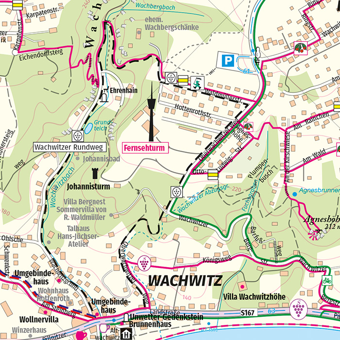 Beinhaltet alle markierten Wanderwege, den Sächsischen Weinwanderweg als auch Radwege mit deren Kennzeichnung.