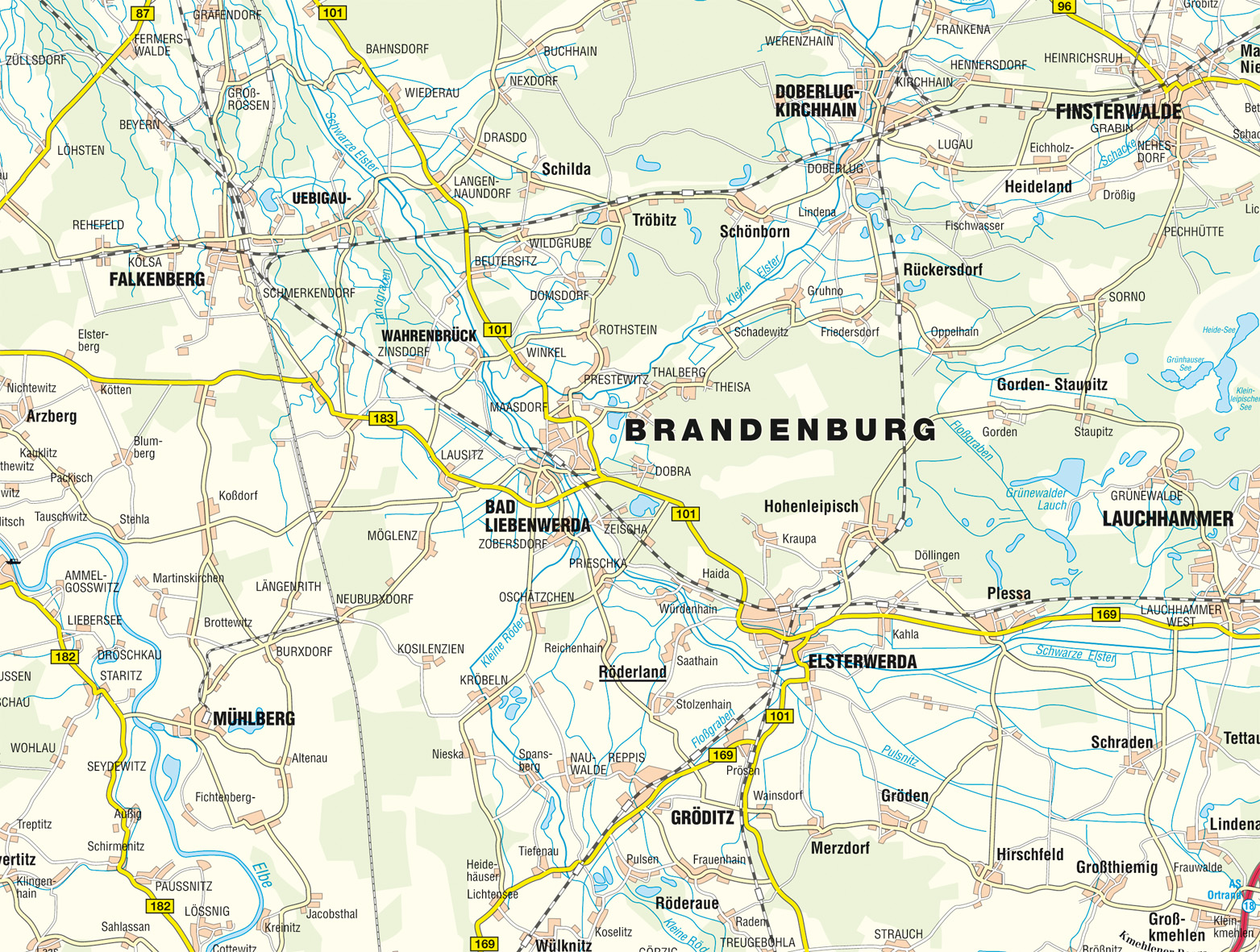 Umfasst das Gebiet des Naturparkes Niederlausitzer Heidelandschaft mit den Ortschaften Elsterwerda, Plessa, Doberlug-Kirchhain, Falkenhain und Bad Liebenwerda. Weiterhin ist das Gebiet um Mühlberg und Gröditz dargestellt.
