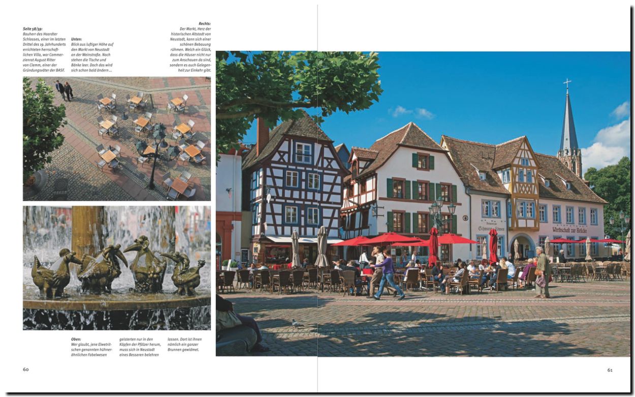 Über 180 Bilder zeigen die Pfalz in all ihren Facetten. Vier Specials berichten über den Speyrer Dom, der zum UNESCO-Weltkulturerbe gehört, über das Hambacher Fest, die kulinarischen Spezialitäten der Region und die zahlreichen Feste wie zum Beispiel das Keschdefeschd in Annweiler oder den Wurstmarkt in Bad Dürkheim.