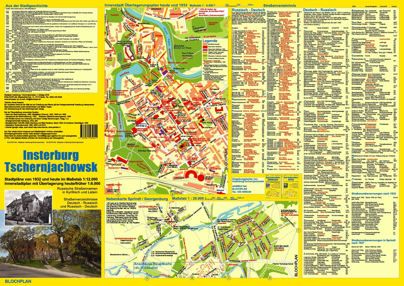Stadtpläne von 1932 und heute im Maßstab 1:12.000; Russische Straßennamen in Kyrillisch und Latein Straßenverzeichnisse Russisch - Deutsch und Deutsch - Russisch; Nebenkarte Sprindt / Georgenburg 1:20.000