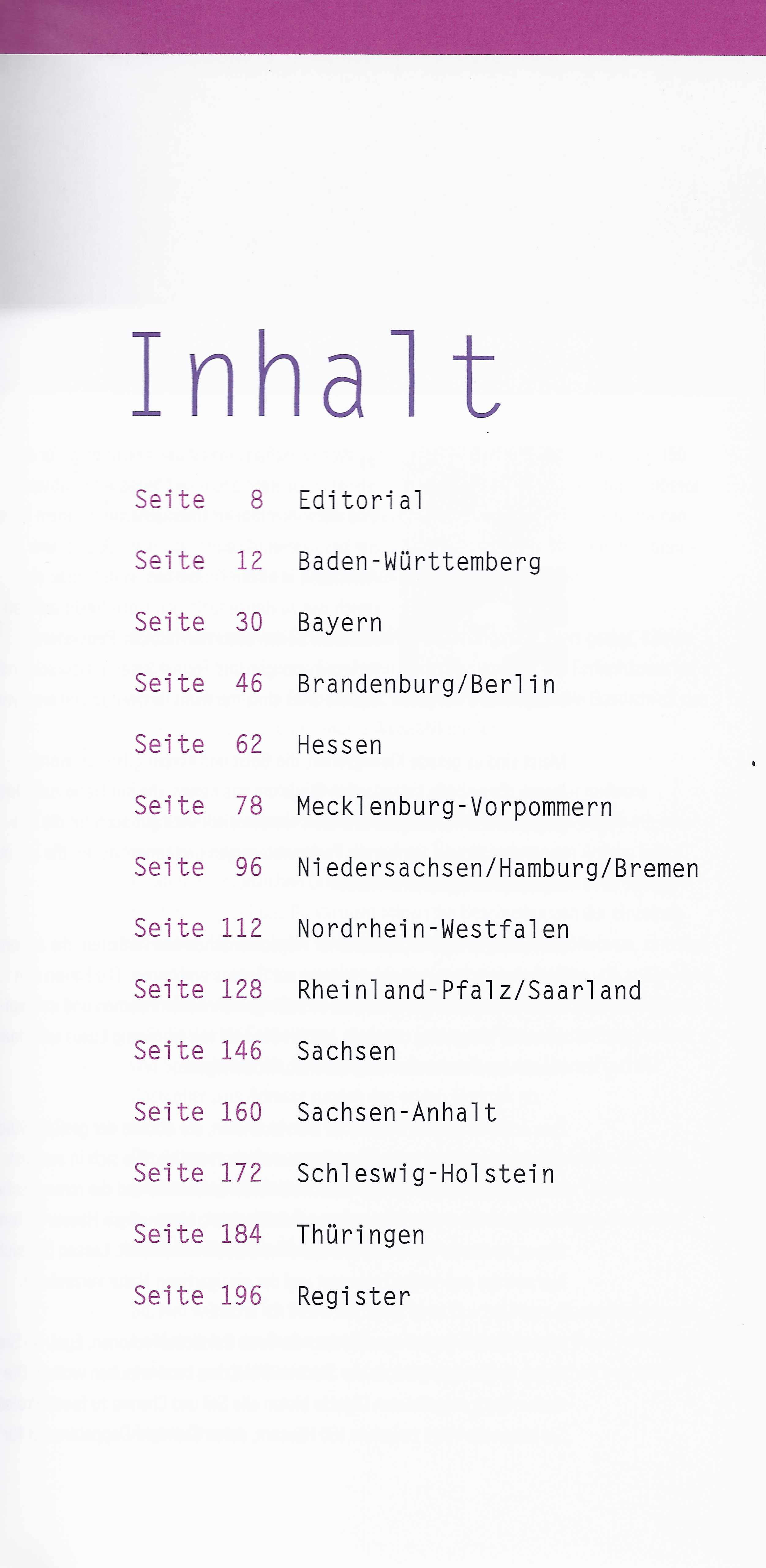 Der Führer ist in zwölf Kapitel unterteilt, die entweder ein oder mehrere Bundesländer behandeln. Innerhalb des Kapitels wurde jedes Objekt mit einer Nummer versehen, die ebenfalls auf der Übersichtskarte am Anfang jedes Kapitels zur räumlichen Orientierung eingezeichnet ist. Nach einer kurzen Einstimmung auf das Bundesland folgen die Beschreibungen der einzelnen Adressen. Um möglichst umfassend über die Objekte zu informieren, sind von jedem Haus drei Fotos zu sehen.