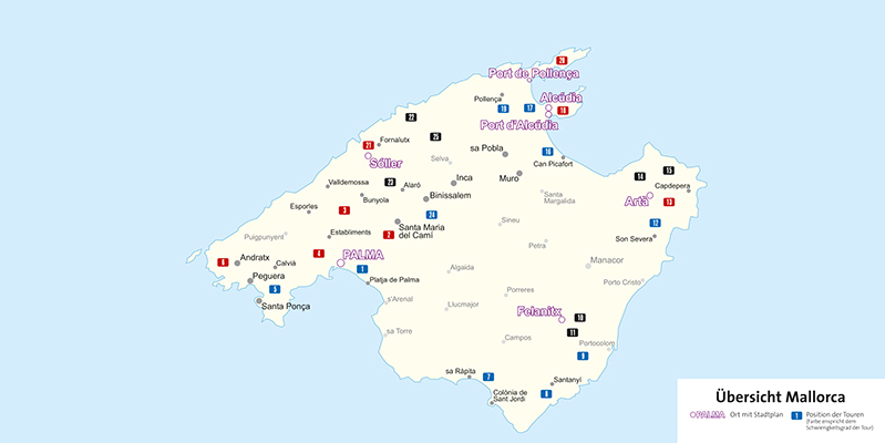 - Die Insel bietet für jeden Rad-Geschmack das Passende: Ebene Radwege und Nebenstraßen im Süden, Abstecher zu den schönsten Stränden im Osten und Norden, hügelige Routen auf der Inselebene Es Pla oder sportliche Strecken im unberührten Bergland der Serra de Tramuntana.