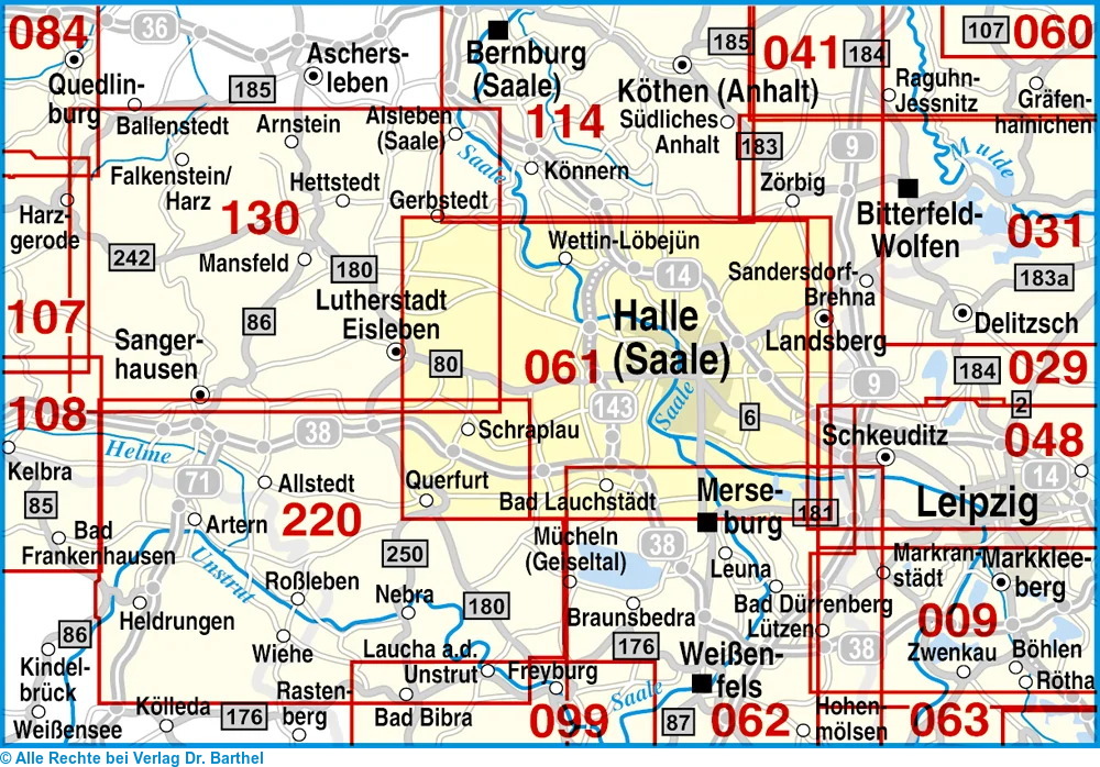 | Schlagworte | Burg Giebichenstein • Dölauer Heide • Europäischer Fernwanderweg E11 • Goethetheater • Gosewanderweg • Götschetal • Halle • Historischer Park • Jakobsweg • Kabelsketal • KTN/Karten, Stadtpläne, Atlanten/Deutschland • Landkarten • Landsberg • Saale • Saalkreis; Karten • Saalkreis, Karte; Radkarte • Saalkreis, Karte; Wanderkarte • Saalkreis; Radkarten • Saalkreis; Wanderkarten • Sachsen-Anhalt • Salzmünde • Straße der Romanik • Teutschenthal • Wanderkarten • Wandern • Weiße Elster |