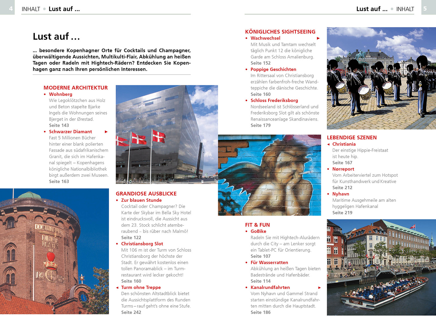 HINTERGRUND Fakten - Stadtgeschichte - Kunst und Kultur - Berühmte Persönlichkeiten ERLEBEN & GENIESSEN Am Abend - Essen und Trinken - Feste und Events - Mit Kindern unterwegs - Museen - Shopping - Stadtbesichtigung - Übernachten TOUREN Das alte Kopenhagen Szeneflair und Großstadtoasen Highlights der Hafenfront Ausflüge SEHENSWERTES von A bis Z PRAKTISCHE INFORMATIONEN KURIOSES KOPENHAGEN