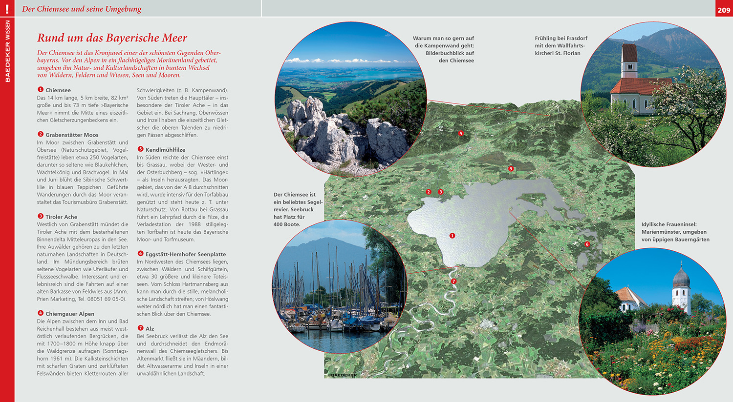 Infografiken erklären bildhaft u.a. Oberbayern auf einen Blick, typisch Oberbayerisches und Barock und Rokoko in Oberbayern. Einzigartige 3D-Darstellungen lassen den Chiemsee und die Chiemgauer Alpen zum Greifen nah werden und geben lebendige Einblicke in die Münchner Residenz, Schloss Neuschwanstein und die Wieskirche.