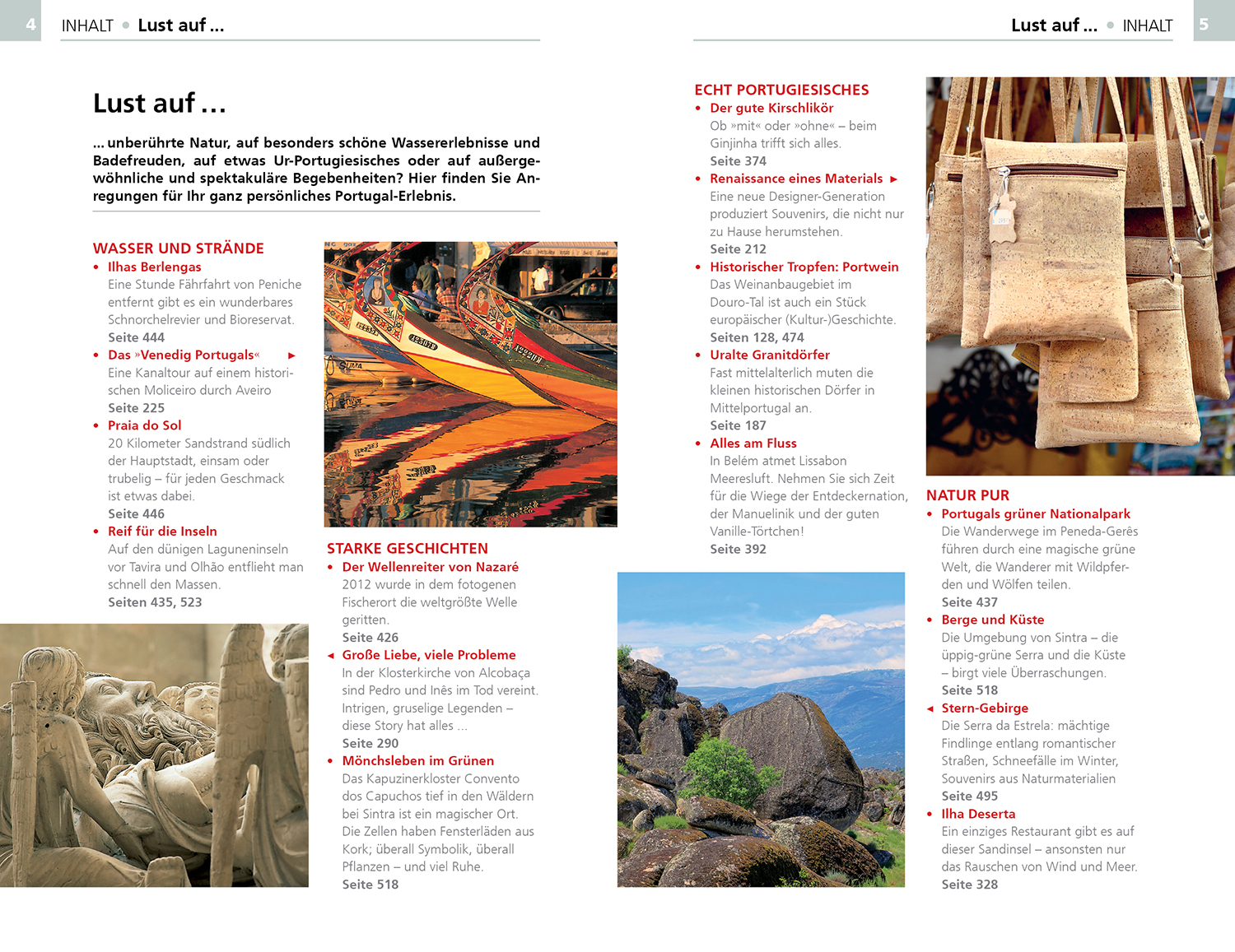 Entdecken Sie Portugal unterwegs: Spannende Touren führen in ganz unterschiedliche Regionen. Erholung und Sightseeing im Süden, Kunst und Kultur in Mittelportugal und unberührte Landschaften und geschichtsträchtige Städte im Norden. Und für alle, die viel Zeit haben, führt eine große Rundreise durch das gesamte landschaftliche und kulturelle Spektrum. Orte, die man auf keinen Fall verpassen sollte, sind im großen Kapitel Sehenswürdigkeiten von A - Z ausführlich beschrieben.