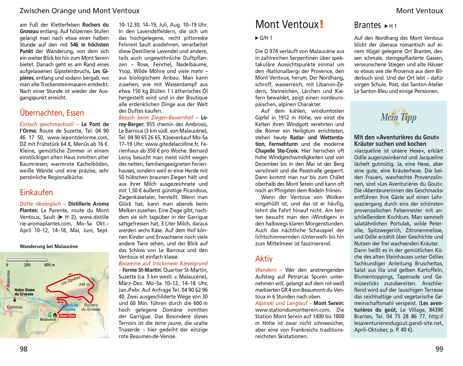 Provence persönlich. Reiseinfos, Adressen, Websites. Magazinteil (Panorama) mit Daten, Essays, Hintergründen. Zwischen Orange und Mont Ventoux. Avignon und Comtat Venaissin. Nîmes und Umgebung. Arles, Alpilles und Camargue. Marseille und Umgebung. Aix-en-Provence und Umgebung. Im Luberon. Durch die Haute-Provence. Sprachführer, Kulinarisches Lexikon. 36 Karten und Pläne plus eine separate Reisekarte im Maßstab 1:350.000.