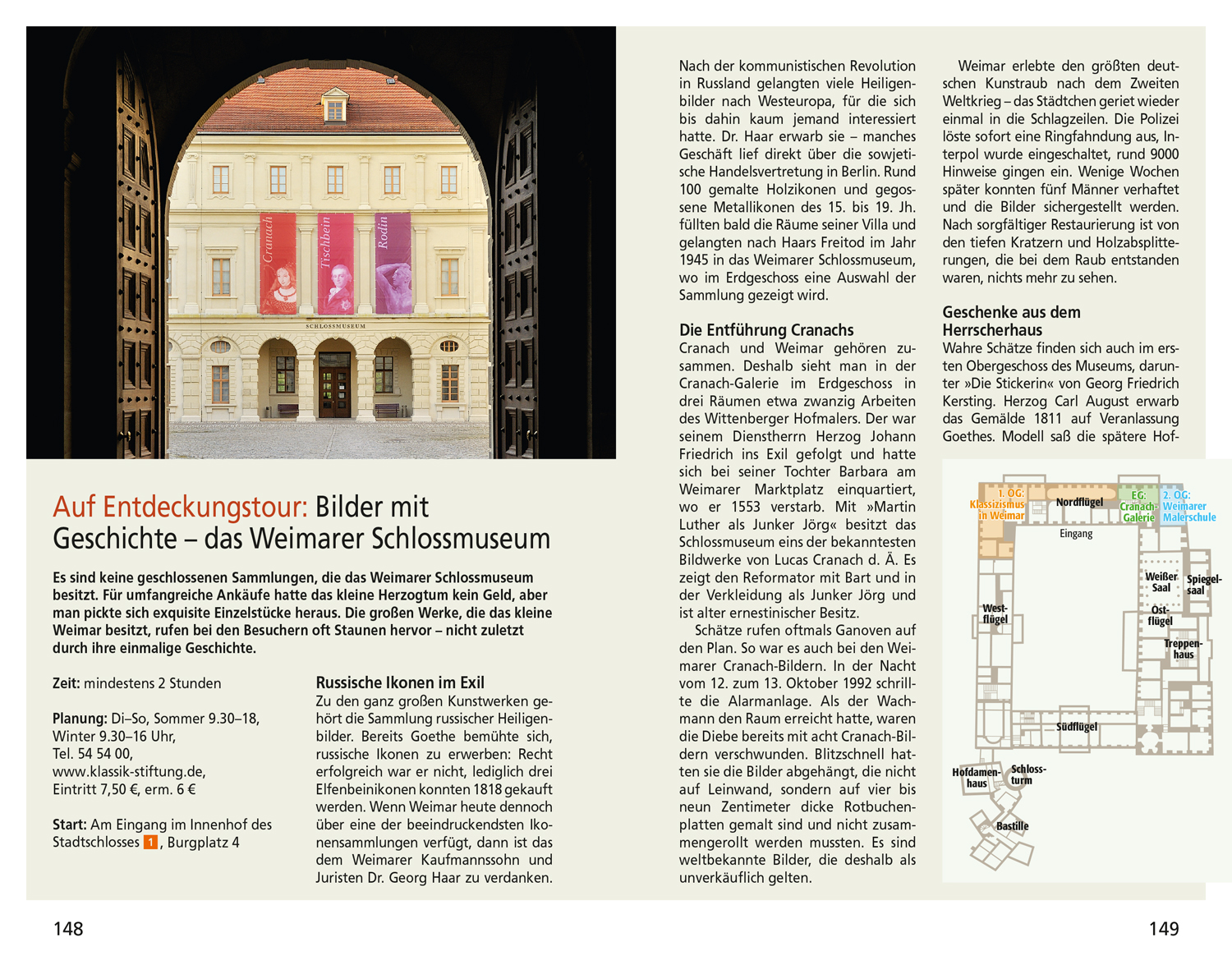 Weimar persönlich. Reiseinfos, Adressen, Websites. Magazinteil (Panorama) mit Daten, Essays, Hintergründen. Südliche Altstadt. Nördliche Altstadt. Im Norden Weimars. Im Süden Weimars. Ausflüge in die Umgebung. 35 Karten und Pläne plus eine separate Reisekarte im Maßstab 1:12 000.