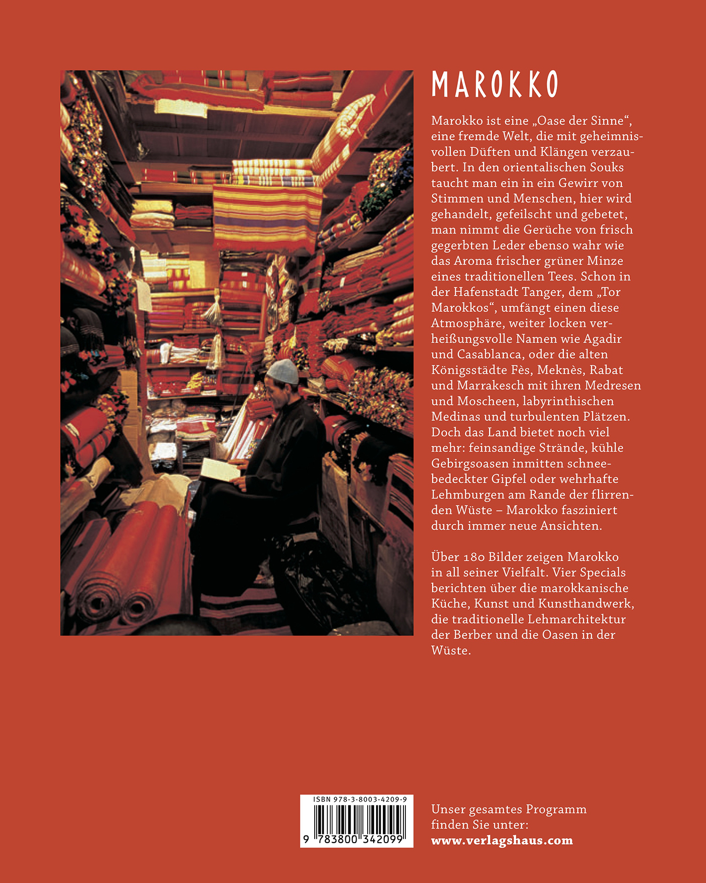 Über 180 Bilder zeigen Marokko in all seiner Vielfalt. Vier Specials berichten über die marokkanische Küche, Kunst und Kunsthandwerk, die traditionelle Lehmarchitektur der Berber und die Oasen in der Wüste.
