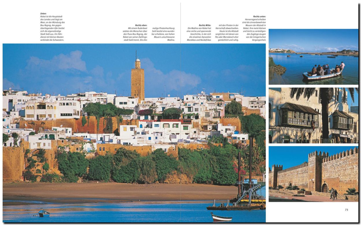 Schon in der Hafenstadt Tanger, dem „Tor Marokkos“, umfängt einen diese fremde Welt mit einer Wolke aus orientalischen Geräuschen und Gerüchen. Weiter locken verheißungsvolle Namen wie Agadir und Casablanca, oder die alten Königsstädte Fès, Meknès, Rabat und Marrakesch mit ihren Medresen und Moscheen, labyrinthischen Medinas und turbulenten Plätzen, wie dem der Djamaa el-Fna. Dort geben täglich die Gaukler, Geschichtenerzähler, Akrobaten und Schlangenbeschwörer von Marrakesch ihr zauberhaftes Schauspiel wie aus Tausendundeiner Nacht.