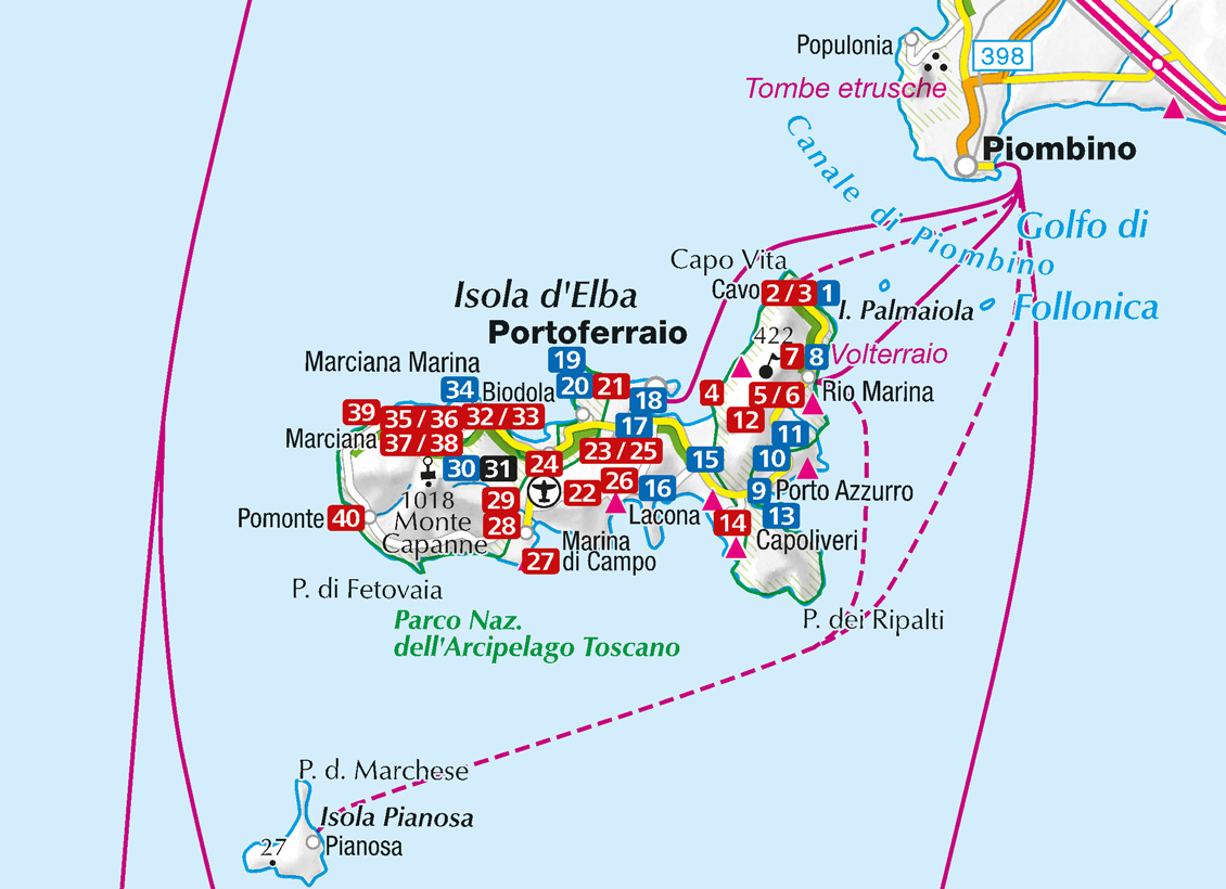 - Größte Insel des Toskanischen Archipels; Hauptstadt Portoferraio (ca. 12000 Einwohner) ist auch Hauptfährhafen; schöne Altstadt mit zahlreichen Spuren aus der Napoleonischen Zeit; 147 km Küstenlänge.
