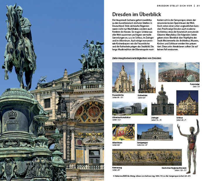 Dresden stellt sich vor:-Themen- und Tagestouren -Dresden auf der Karte -Die Geschichte Dresdens -Dresden im Überblick -Das Jahr in Dresden -Flusspanorama Die Stadtteile Dresdens:-Westliche Altstadt -Östliche Altstadt -Neustadt -Großer Garten -Loschwitz -Abstecher -Spaziergänge -Ausflüge Zu Gast in Dresden:-Hotels -Restaurants -Shopping -Unterhaltung -Sport und Aktivurlaub -Wellness -Dresden mit Kindern Grundinformationen:-Praktische Hinweise -Anreise -In Dresden unterwegs -Stadtplan -Textregister -Danksagung und Bildnachweis -Sächsisch für Anfänger -DVB-Plan
