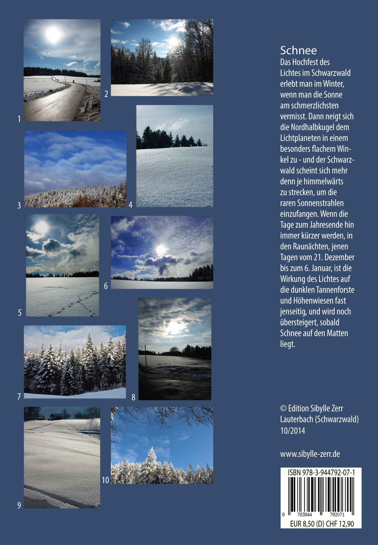 Als Autorin ist Sibylle Zerr weit gereist. Für kostbare lichte Augenblicke hat sie sich hier nun endlich die Landschaft ihrer Kindheit erwandert. Das Ergebnis sind Ansichten von entsprechender Tiefe. En tant qu’auteure, Sibylle Zerr a effectué de nombreux voyages. Afin de recueillir des instants lumineux précieux, elle s’est enfin lancée sur les chemins des paysages de son enfance. Il en résulte des vues dont se dégage une profondeur conséquente. Author Sibylle Zerr is widely travelled. For invaluable bright moments, she hiked through the landscape of her childhood finally. The findings are prospects of considerable depth.
