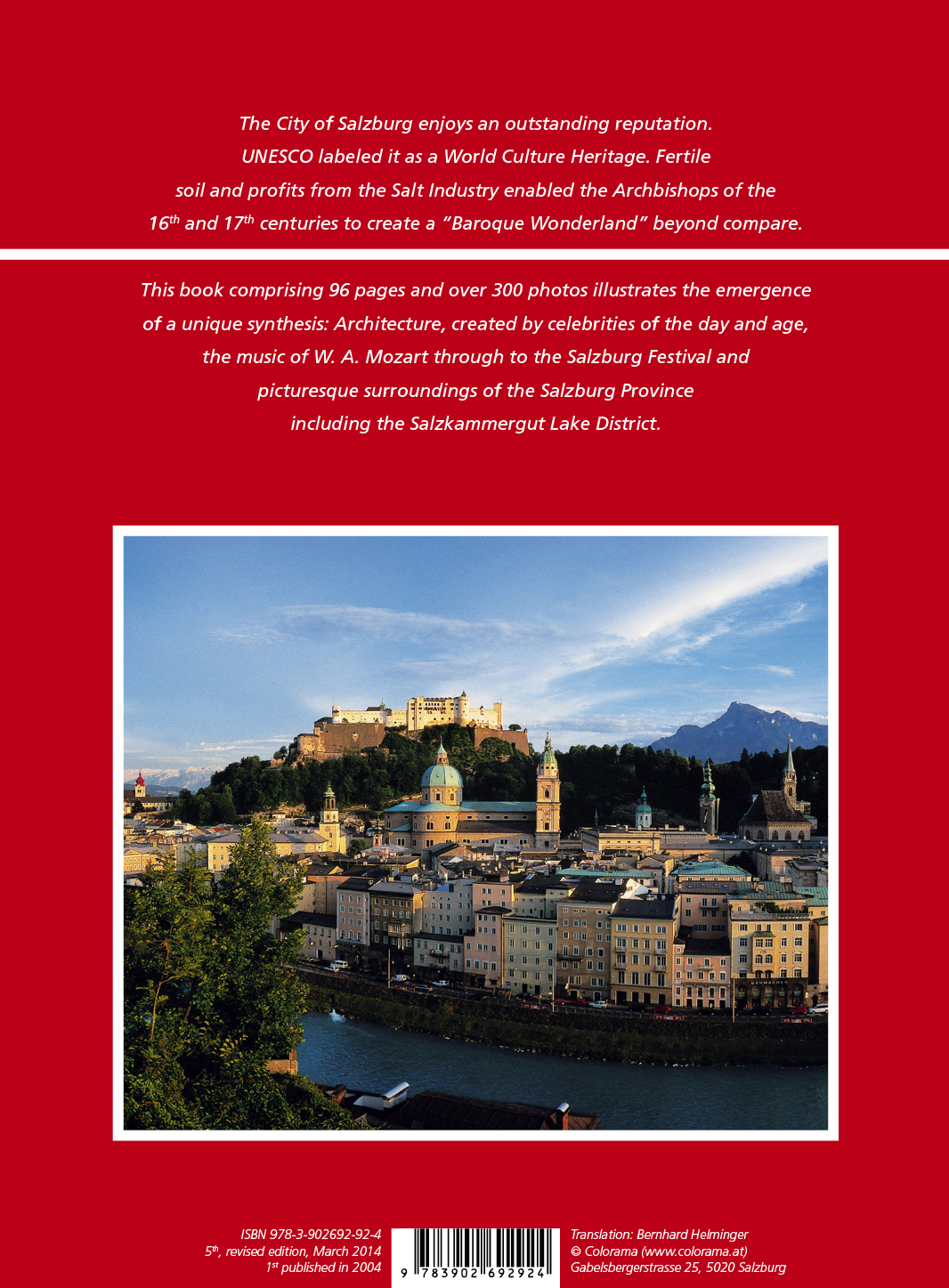 The City of Salzburg enjoys an outstanding reputation. UNESCO labeled it as a World Culture Heritage. Fertile soil and profits from the Salt Industry enabled the Archbishops of the 16th and 17th centuries to create a "Baroque Wonderland" beyond compare.This book comprising 96 pages and over 300 photos illustrates the emergence of a unique synthesis: Architecture, created by celebrities of the day and age,the music of W. A. Mozart through to the Salzburg Festival and picturesque surroundings of the Salzburg Province including the Salzkammergut Lake District.