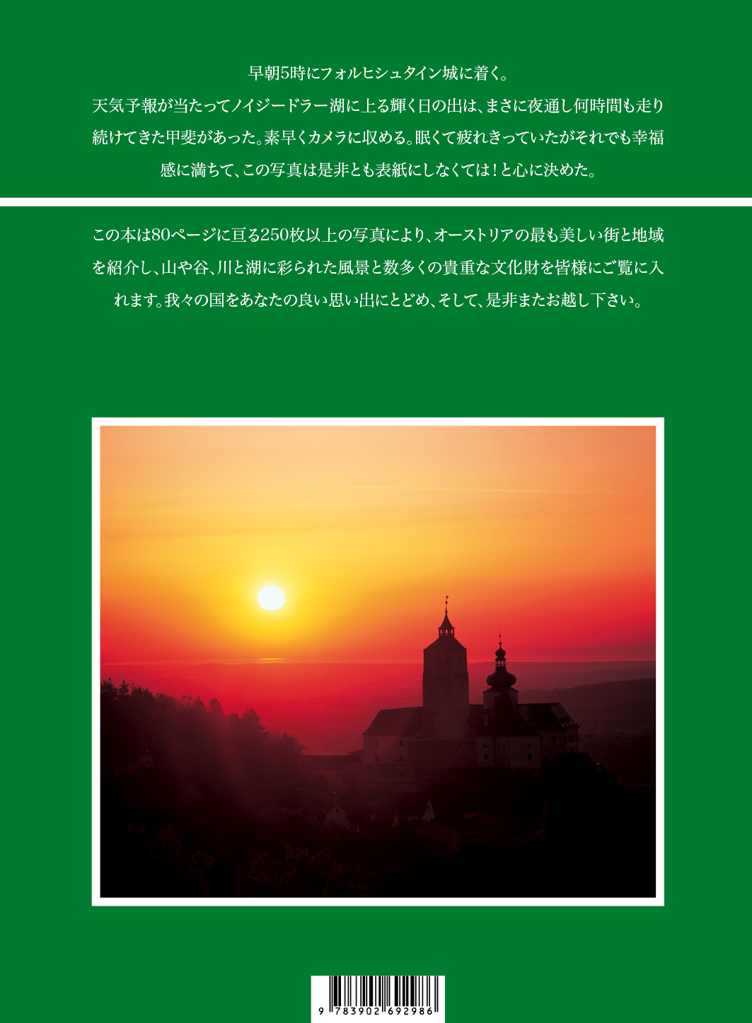 Um fünf Uhr früh erreiche ich Burg Forchtenstein und tatsächlich: Die Wetterfrösche haben recht behalten. Es ist ein strahlender Sonnenaufgang über dem Neusiedler See, was für eine Belohnung für die stundenlange Fahrt durch die Nacht! Die Aufnahme ist schnell im Kasten und müde, erschöpft, aber dennoch überglücklich beschließeich: Dieses Bild muss aufs Cover! Auf 80 Seiten und mit mehr als 250 Bildern möchte ich Ihnen die schönsten Städte und Regionen Österreichs vorstellen. Dieses Buch soll Ihnen einen Überblick über die von Bergen und Tälern, Flüssen und Seen geprägte Landschaft und die vielen kulturellen Kostbarkeiten bieten. Behalten Sieunser Land in guter Erinnerung und. kommen Sie wieder!