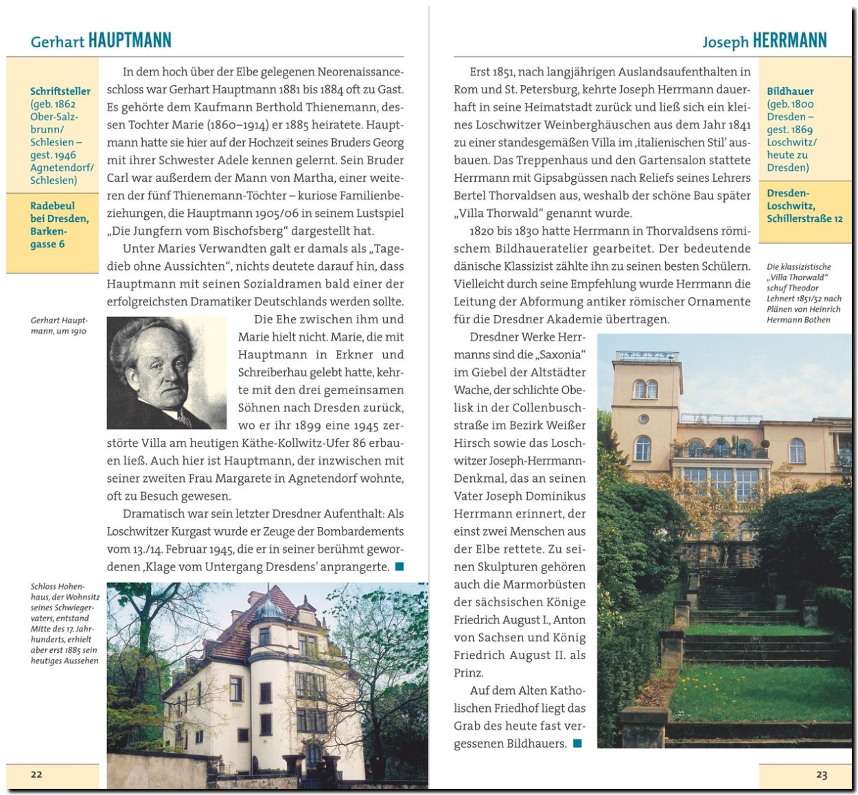 Eine Auswahl von ca. 60 Kurzbiografien bekannter und auch fast vergessener Dresdener führt zu ihren einstigen Lebens- und Wirkungsstätten. Von Albrecht Prinz von Preußen über Otto Dix und Fritz Löffler bis zu Hugo Zietz werden Dresdener Persönlichkeiten vorgestellt.