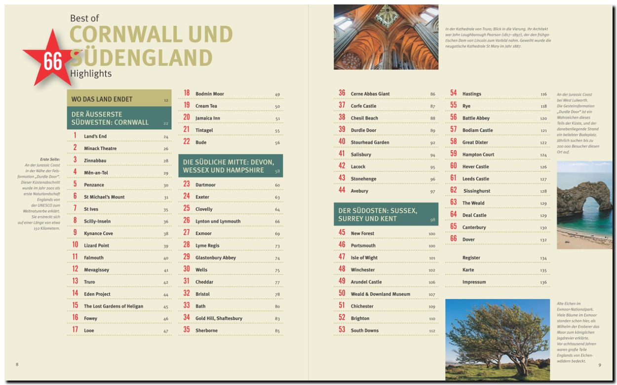 Kernow bys vyken! Cornwall für immer! , heißt es nach dem Absingen von Cornwalls Nationalhymne, und tatsächlich übt der südwestlichste Zipfel Englands eine ungebrochene Faszination aus. Es ist ein altes Land, das schon immer die romantischen Vorstellungen der Menschen beflügelt hat. So ist Cornwall nicht nur das Geburtsland des legendären Königs Artur, sondern auch Schauplatz der zahlreichen Rosamunde-Pilcher-Romane. Doch auch Devon mit seinen Nationalparks Dartmoor und Exmoor, Somerset mit der UNESCO-Weltkulturerbe-Stadt Bath, Dorset mit seiner einzigartigen Küstenlandschaft, Wiltshire mit den vielen urgeschichtlichen Zeitzeugen und die östlichen Grafschaften Hampshire, Sussex, Surrey und Kent locken mit Naturschönheiten und viel Kultur in den Süden Englands.