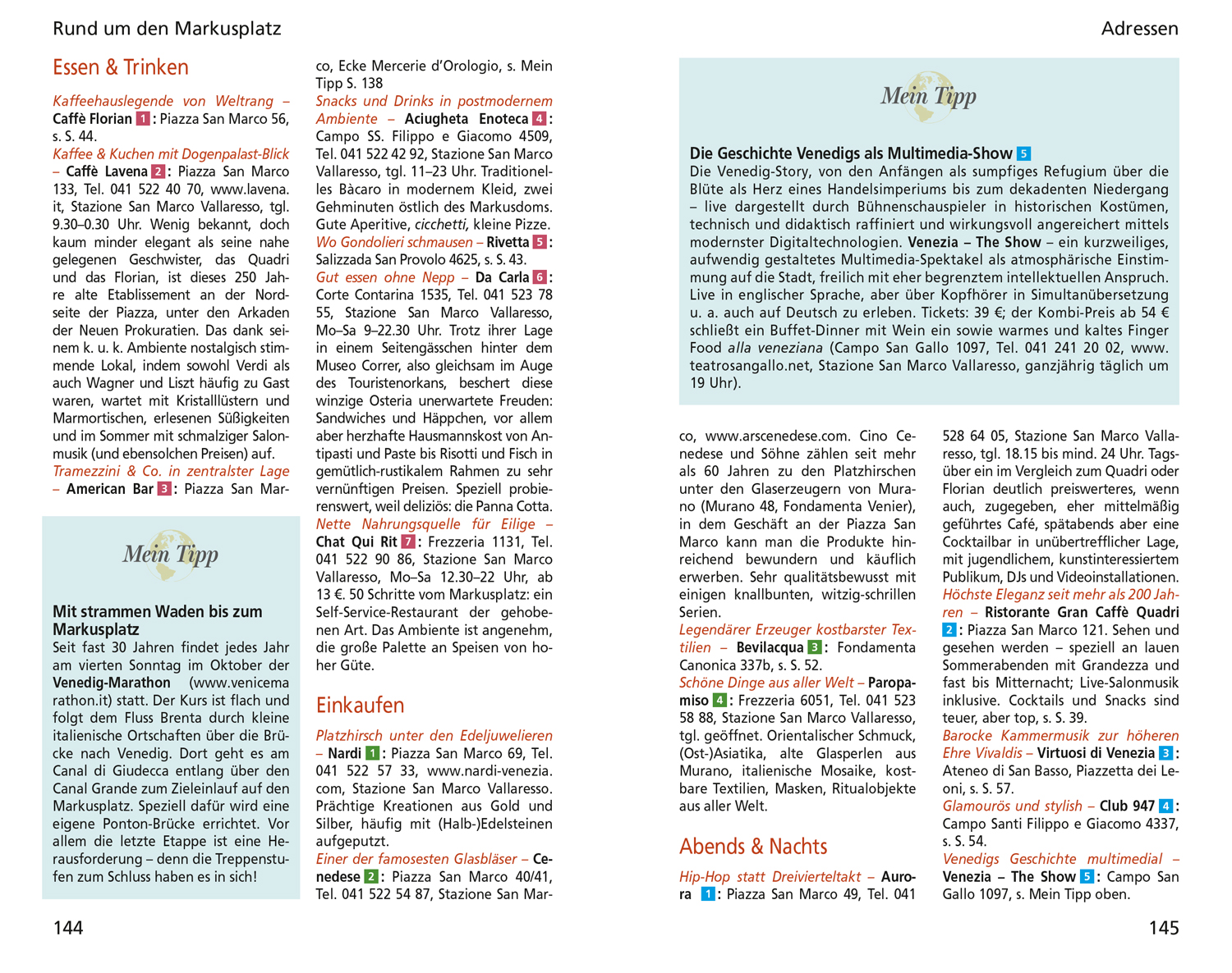 Venedig persönlich. Reiseinfos, Adressen, Websites. Magazinteil (Panorama) mit Daten, Essays, Hintergründen. Rund um den Markusplatz. San Marco. Cannaregio. Castello. San Polo und Santa Croce. Dorsoduro, San Giorgio und Giudecca. Der Lido und die Laguneninseln. Sprachführer, Kulinarisches Lexikon. 32 Karten und Pläne plus eine separate Reisekarte im Maßstab 1:5000.