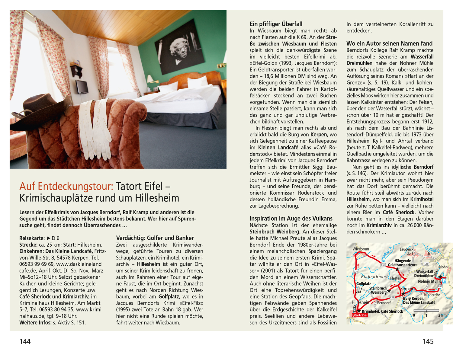 Eifel persönlich. Reiseinfos, Adressen, Websites. Magazinteil (Panorama) mit Daten, Essays, Hintergründen. Nordeifel mit Aachen und Hohem Venn. Die Kalkeifel. Ahreifel und Osteifel. Sahrbachtal und Kesselinger Tal. Die Vulkaneifel. Südeifel mit Trier. Westeifel. Die Belgische Eifel. 40 Karten und Pläne plus eine separate Reisekarte im Maßstab 1:370.000.